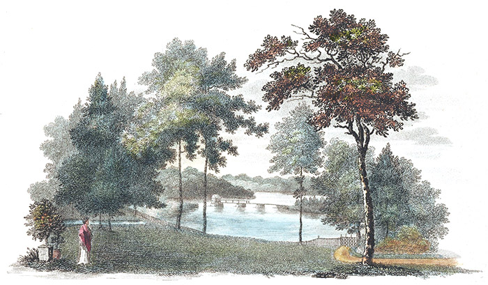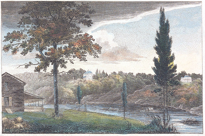 It is impossible for the artist, who has fixed his attention upon the various beauties of Schuylkill, to leave the study of its charms. Here you pass from the wild romantic scene; the rugged stone with wood and water bound to expand the sight from this high lifted lawn, to view in open space the world below, the riches of the richest state; the big metropolis in the woods, the chequered country with her merchants’ seats; the bustle of agriculture, and the verdant banks of the fluid mirror that reflects the sky; and further on to view Mount Holly mingled with the air in Jersey. The whole a soft and visionary scene.