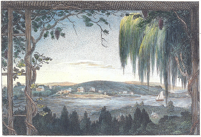 This view is taken from the piazza of the seat of General Stevens on Long Island, near that extraordinary channel called Hell-gate, on the East river, or sound. The view was taken in the morning at the rising of the sun, when a glow of light from the arch of Heaven, exhibited to the view almost innumerable seats, spread over an extensive country which glittered as the sun arose, like so many stars in the firmament, upon the face of this beautifully variegated Island. The scene extending across the North river to the Jersey shore.