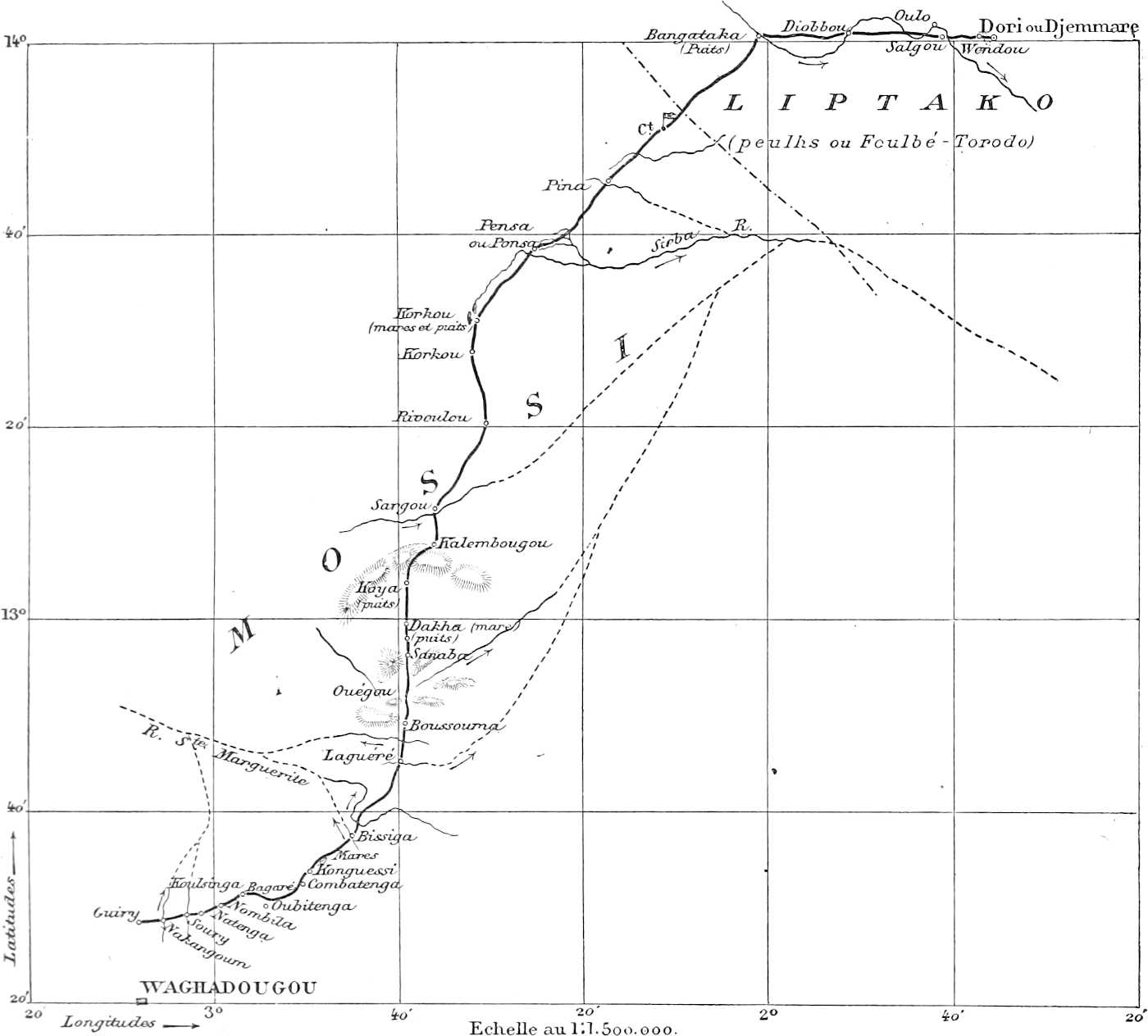 Ces régions n’avaient guère été visitées depuis le célèbre voyageur allemand Barth. Seuls Fleyel et plus tard Staundinger et Ernst Hartret, son compagnon, avaient atteint Sokkoto en venant du Sud. Le Bornou, Kouka du moins et les États situés au sud et à l’est du Tchad, avaient été visités de 1870 à 1873 par le célèbre voyageur, Allemand aussi de nationalité, Nachtigal. Je ne dois pas omettre non plus le voyage au Bornou de Ghérard Rholfs, en 1867.
