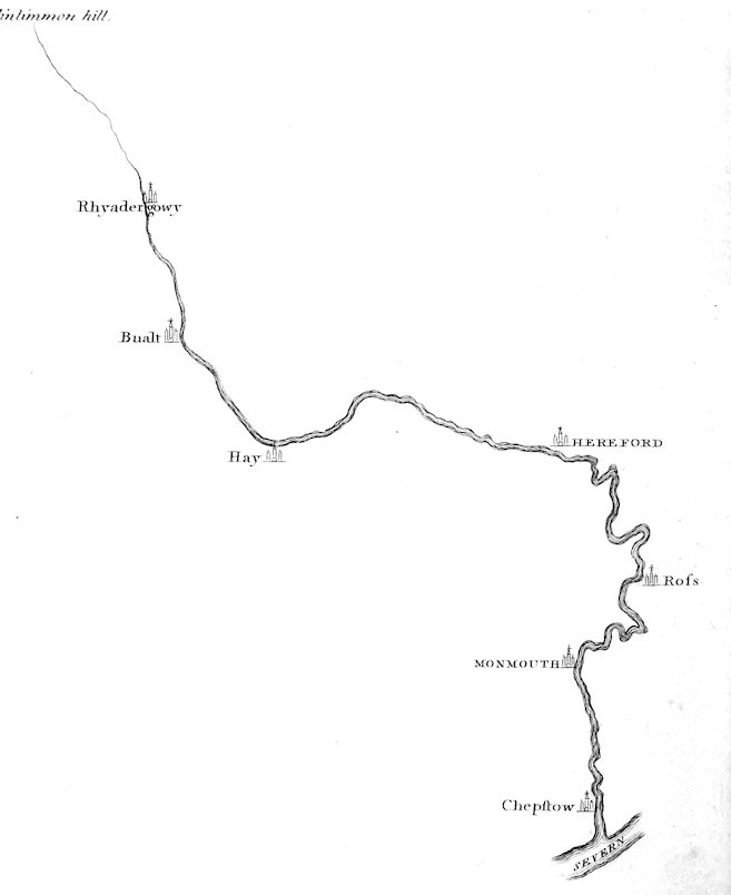 From a small spring near the summit of Plinlimmon Hill, the boundary of the northern part of Cardiganshire, our river Wye derives its source. Issuing from a spacious hollow in this mountain, the water falls in a narrow streamlet several hundred yards 2nearly perpendicular, till meeting with various small currents, it soon presents itself in the shape of an immense cataract, rolling with astonishing rapidity over the rocky prominencies which seem to impede its course. The name of this river appears anciently to have been a common appellation, either for river or water. Camden says, that the word gwy or wy signifies water, and instances the following names which have that termination, as proofs of his opinion; viz. Lhugwy, Dowrdwy, Edwy, Conwy, Elwy, Towy, Tawy, &c. &c. From the same ridge of mountains, within two miles of the source of the Wye, the rivers Severn and Rydall derive their origin: the latter of which empties itself into the Irish sea at Aberystwith. The views from this huge and dreary hill are wild and extensive beyond description; they exhibit mountains, rolling as it were, over each other, and under the most sublime forms and 3beautiful hues, varying and shifting till they insensibly lose themselves and melt into the horizon. We were peculiarly fortunate in having a bright and clear day to view in all its grandeur this sublime and picturesque scenery; an advantage which an experienced guide informed us had scarce ever occurred during a course of many years in those airy regions, where it was almost invariably his fate to encounter a heavy and hazy atmosphere, commonly attended with rain. On this lofty mountain the famous Owen Glyndwr, in the summer of 1401, posted himself, says the historian, “with great policy at the head of a hundred and twenty men of arms.” The situation of Plinlimmon Hill being on the limits of Cardiganshire and Montgomeryshire, was admirably adapted for receiving the succours of his vassals and friends from every part of the principality. From this fastness his adherents, who were the terror of all that opposed him, were perpetually 4making excursions, and plundering the neighbouring counties; amongst which Montgomeryshire appears to have been the greatest sufferer.