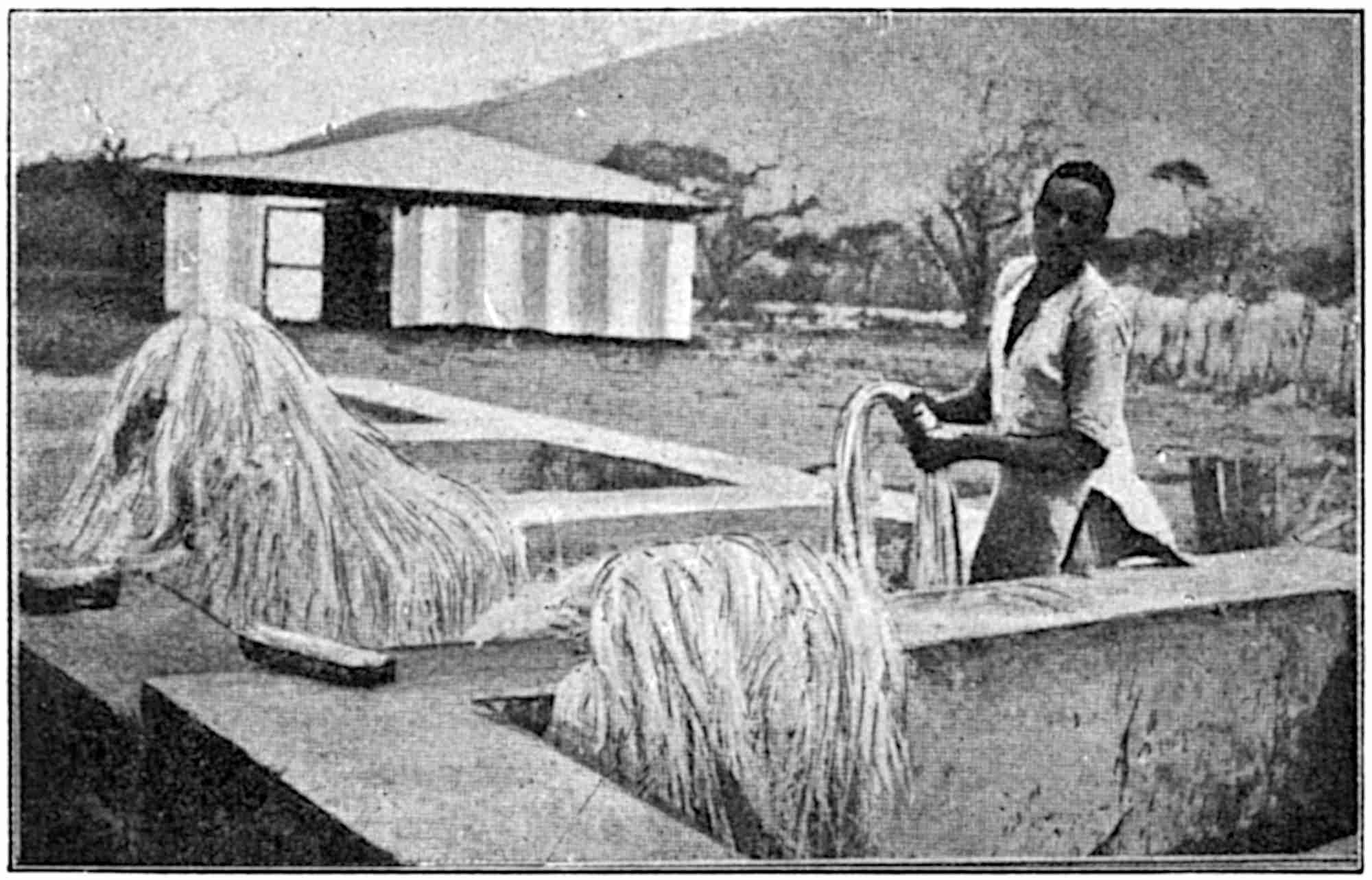 A typical example of a leaf plant from which one 7type of textile or cordage fibre is extracted is illustrated in Fig. 1. This particular example is designated as a “Two-year-old Sisal Plant.” It is 49 in. high, and was grown in the Voi district, British East Africa. Sisal is the commercial name of the fibre obtained from such plants, while the botanical name of the plant is Agave 8Rigida, variety Sisalana; it is sometimes, though erroneously, termed the Americana.