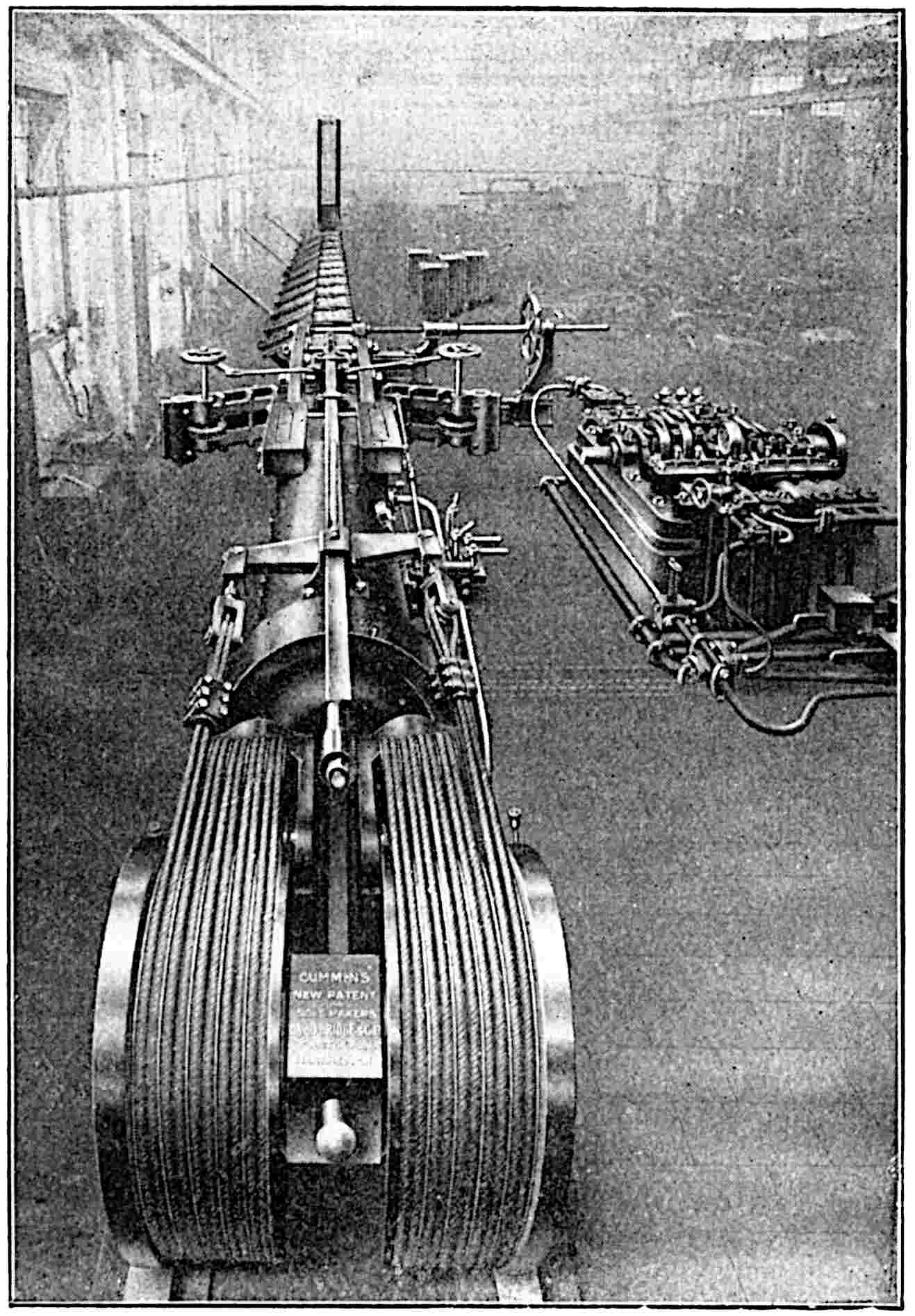 To form the strands into a rope, it is essential to use a fixed or stationary machine along with the traveller and a top-cart. The stationary machine is substantially built, and, inter alia, is provided with a central spindle around which are grouped a set of hooks—usually in sections of two circles. Two wheels on the central spindle 104drive a number of pinions, one behind each hook, the ratio of one wheel to half the pinions is 34 to 16, while the ratio of the other wheel to the other half of the pinions is 54 to 11. Thus, the revolutions may be—