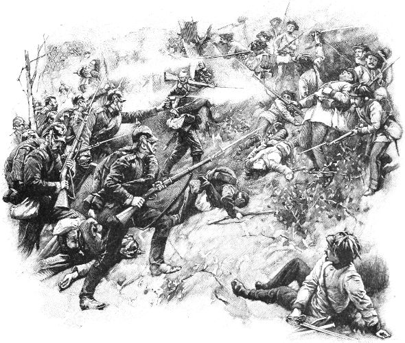 Circumstances had compelled us to retreat, but it was no part of a British soldier’s training to shirk a battle at the last moment; consequently, the low hills behind Elvina were soon echoing to the rattle of musketry as our black-gaitered infantry opened fire on the French columns.