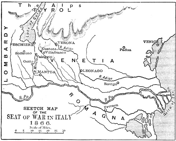 [3] The Affondatore was a new ship built in the Thames just before the war. A correspondent of the Times who saw her at Cherbourg, where she called on her way down Channel, wrote that she looked sufficiently formidable to destroy the whole Austrian ironclad fleet singlehanded.