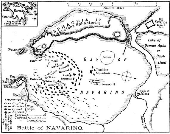 The immediate causes which led to the battle of Navarin, or Navarino, are of a romantic and dramatic character. On the 6th of July, 1826—the Greeks having risen in revolt against the oppression of the Turks in 1820—a treaty had been signed in London on the part of Great Britain, France, and Russia, having for its object the pacification of the Levant by intervention between Turkey and Greece. Through the indiscretion of some unknown official the treaty found its way to the Times, which published it in its issue of July 12th, 1826—six days after its signature. It thus became fully known to all concerned before the official instructions which it rendered necessary could be delivered. As a result, Sir Edward Codrington, the British admiral in the Mediterranean, found himself in a situation of perplexity, and was directed to consult with the French and Russian admirals, and arrange a plan of action with them.