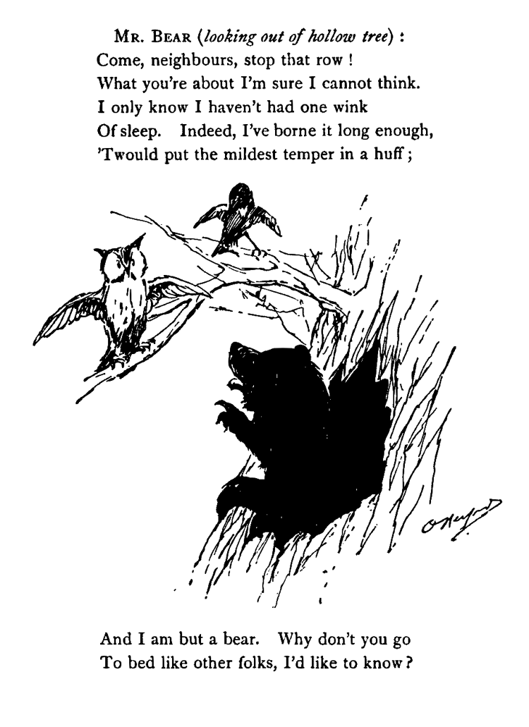 Dear Mr. Owl and Mr. Bear, good-bye! [Exit.