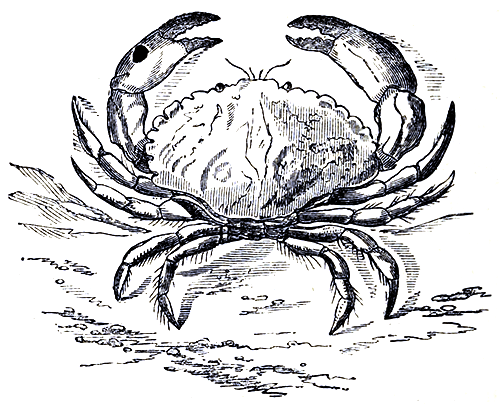 A great deal of this esteem, it is to be feared, somewhat resembled the great affection professed by a chief of the Feejee Islands for a very good-looking little midshipman of one of Her Majesty’s ships cruising among those fertile but questionable retreats. “I love him very much,” said the dusky potentate, “because he is so plump, and would make such a delicious roast with palm-top stuffing.” Apicius loved Crab because he was good in many ways. Hear what he says of Crab sausages: “Boil some of these animals, reduce them to a pulp; mix with this some spikenard, garum, pepper, and eggs; give to this the ordinary shape of sausages, place them on a stove or gridiron; and you will by this means obtain a delicate and tempting dish.” He also informs us that a Crab may be served whole, boiled, and accompanied by a seasoning of pepper, cummin, and rue, which the cook skilfully mixes with garum, honey, oil, and vinegar. Later on in history we find our friend Cancer depicted in heraldic devices, and among the armorial bearings of many influential families. So we see that his lineage is an ancient one. The family to which he belongs is extremely [Pg 4]numerous, and it is with the peculiarities of some of its members that we shall now have to deal.