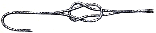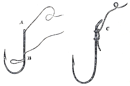 To safely bring a large fish to basket after it is hooked requires skill, patience, and proper appliances. Hooks and their attachments to the traces should be well looked to before commencing operations. There are two modes of fastening on fish-hooks. One, as in [Pg 13]the foregoing cut A, is with well-waxed silk or thread, binding the hook-wire and trace firmly and neatly together, and then finishing off by passing the end of the lashing back under three or four turns of itself, vide cut B, and then drawing it tightly home. The other plan is by half hitches, two or three of which are turned over the shaft of the hook below the flattened end usually made to sea-hooks; when drawn tight the turns of line may be pressed up compactly together with the thumb nail. The accompanying cut C will better explain the mode of putting on the hitches than would any written description. Both traces and lines should have loops made in the ends; these, when run together by what is called the loop slip, shown in the above illustration, make a very neat and secure fastening. Stones are conveniently fastened on as sinkers to lines mounted with many hooks; by the plan shown in the above cut, no knots are made, and [Pg 14]when the stone is removed the loop falls out and leaves the line as before its attachment. Large powerful fish should never be lifted into the boat by the tackle. A wide, short-handled landing-net, and gaff, made from a large-sized fish-hook, lashed to a staff, form an essential part of the equipment.