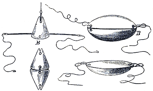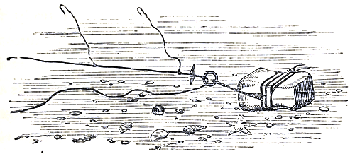 Rod-fishing for mackerel bass, grey mullet, “Atherene” or sand smelt, and several other descriptions, may, at times, be practised with considerable success. We have taken great numbers of the two former with both [Pg 19]bait and artificial fly. Mackerel fishing with the float-line affords, at certain seasons, excellent sport. A large cork float, four-foot trace of single salmon gut, and one medium-sized Limerick trout-hook should be used; three or four duck-shot will be found, with the swivel, sufficient to keep the trace straight. Bait with either pilchard gut, a strip cut from the tail of a freshly-caught mackerel, or a long narrow ribbon of cuttle; cap the float to about fourteen feet from the hook and let the bait drift off with the tide. We have repeatedly taken numbers of mackerel in this way when hand-lines of the usual pattern were not visited by a single fish. For grey mullet, live shrimps or pieces of rag-worm will be found the best baits. Smelts are taken by mounting a number of very small hooks, No. 12 Kirby bend, on short pieces of very stiff gut looped on to the main traces, at about six inches apart; a light sinker should be made use of, and short junks of rag-worm used as bait. Smelts much frequent localities where fresh water flows into the sea. Lead sinkers, of any weight between seven or eight pounds and that of a buck-shot, can be cast between two common Bath scouring bricks. Half the form of the intended sinker is cut on each brick (after the surfaces have been rendered smooth by rubbing them together) with a common knife or chisel. The two halves, when exactly matched, are tied together with tape and a [Pg 20]small inlet hole made, through which the molten lead is poured from an iron ladle, tobacco-pipe, or iron spoon; according to the quantity of metal required: one brick is sufficient to cast simple forms in, merely cutting out the shape and filling it up. All sorts of articles in lead can be made in this way, without any of the dangers which usually attend casting in clay or damp mould. The two kinds of fishing leads represented in the above cut can be used for a great number of purposes, and are mounted either single or double, as the strength of the under current or run of the tide may render necessary, by passing a few turns of fine packthread or spare snooding through the holes at B, and bringing the flat surfaces of the leads in contact. A great number of bass, codlings and other fish are, in many localities, to be taken by laying out lines baited with whelk, [Pg 21]hermit-crab, &c., to meet the coming tide as it flows in over beaches or sand flats. A heavy lead is often used as a means by which the line and baits are not only kept at the bottom when they reach it, but is turned after the manner of a sling round the head of the fisherman, and then cast far out in the surf, to be withdrawn and again thrown as the take of fish or renewal of bait may render necessary. There are many very great inconveniences attendant on this mode of fishing, and it is far better to lay down a traveller when the tide is out. This is done as follows:—Just before the turn of the tide and the coming in of the young flood, select the spot at which you intend trying your fortunes, and then search out a large heavy stone as your traveller block, and thus prepare it, with strong twine or whipcord; take two or three turns round the stone and securely fasten off with a knot; then attach a common curtain ring or the link of an old chain. Lay your block on the edge of the water, pass one [Pg 22]end of your fishing-line through the ring, and walk back with it some distance up the beach, allowing the other end to be given off the reel until the spot at which the first end was dropped is reached. The line will now be doubled; one half has hooks on short traces, as many as it is thought expedient to use, mounted on it. The other half is free from hooks, in order that it may run through the ring without entanglement. A small piece of stick is knotted on the line close to the first hook, so that it cannot be pulled through the ring, as shown in the illustration on p. 21.
