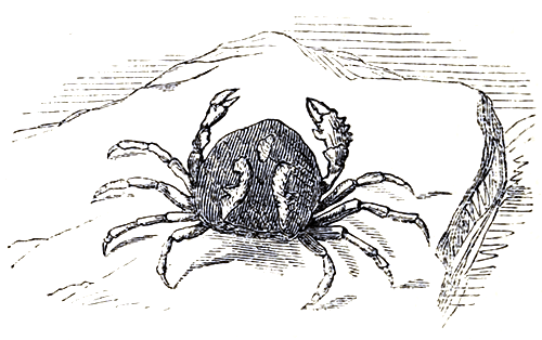 These little fellows, we have every reason to think, are purely inland in their habits, and we know of no instance of their being known to travel either singly or in bodies to the sea coast. A member of the same genera, represented in the annexed cut, is found in many parts of the south of Europe, forming burrows for itself in the river banks, and from this habit obtains the name of Thelphusa fluviatilis. Few specimens reach three inches in length, and the colour is no means inviting, being of a dingy yellow. Yet it appears to have attracted much attention amongst the ancients: both Aristotle and Hippocrates knew it well, [Pg 57]and there are medals which were struck in very early periods bearing representations of this Crab on them. There appear to be some religious associations connected with crustaceans of this description, as we find the monks of the Greek church taking some pains to procure them, and then disposing of the dainty without troubling the cook. In Italy the burrowing Crabs are eaten at Easter, much as we eat hot-cross-buns on Good Friday. There are other Crabs which form burrows both in the sands of the sea-shore and the banks and plains of the interior. One of these is the Sand Crab (Ocypoda arenaria) of naturalists). The wide, open sand stretches of many tropical countries, abound with these remarkably agile little creatures, who excavate holes in the sand close to the borders of the tide. These are the lilliputian pedestrians with whom skylarking midshipmen engage in foot-races along the strand, and meet ignominious defeat in consequence. As autumn approaches, their sea-side retreats are quitted, the inland burrows occupied, and a state of hybernation gone into, until, the winter having passed away and the spring weather come, Seaward ho! is the order of the day again.