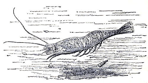 The Indian and Chinese seas yield an endless variety of both the shrimp and prawn families, the latter of a size far beyond anything we see in our more frigid waters (Palæmon carcinus), common to the Indian Ocean and some of the great rivers flowing into it, not unfrequently reaching a foot in length. Those usually sold in the Indian markets are not as large as these, but are still of sufficient size to render them highly attractive; and those who, like us, have eaten prawns in the East, prepared by those who know the secrets of the art, will bear away the remembrance of their flavour as an agreeable souvenir. That is, if the said prawns happen to be free from the curious, and little understood fish poison, with which the denizens of Tropic seas are too often encumbered. In favoured England, no such drawback to the full enjoyment of your prawn-feast need exist; the common difficulty [Pg 86]being the obtainment of a sufficient quantity to enjoy.