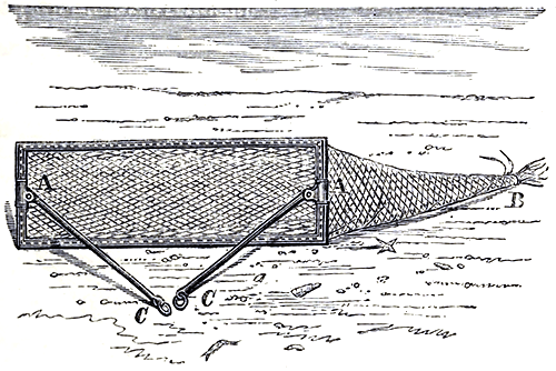 This designing little Genius, after raising his own sand storm, adroitly scoops for himself a tiny trench in the soft material on which he rests, and then remaining perfectly still, allows the falling grains to cover him snugly in, like a sheep in a snow-drift. Great numbers of Shrimps of this kind, as well as small flat fish, and an endless number of odd waifs and strays, can be taken with the dredge—a contrivance shown in the following cut. The framework is of iron, the two straight bars or bridle rods are made so as to play freely round the end bars of the frame, as at a, whilst a sort of hinge joint admits of their moving up or down, thus insuring close contact between the lower [Pg 75]edge of the frame and the bottom, as it is dragged along by a rope, either lowered from a boat or attached to a horse. The extreme end, or purse of the net, is made to untie like the mouth of a bag as at B, which greatly facilitates the removal of its contents when overhauling is needed. The two rings, C C, serve to attach the drag rope to.