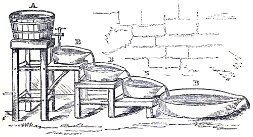 It has been computed that each fully-matured female will produce from 18,000 to 20,000 eggs, and there is little doubt but that with proper management and the expenditure of a very small capital, artificial fecundation of the ova of crustaceans might be most successfully [Pg 93]and profitably conducted in this country. Much attention has of late been paid to this subject in France, and many most interesting experiments in connexion with it have been tried. The annexed cut represents a set of chambers, or troughs, which were erected in the College de France, Paris, for the hatching of the eggs of the various crustacea. 1 is the reservoir in which the water is placed; this runs through the tap, 2, into a series of glass troughs in which gravel has been placed; 3, 3, 3, through which it flows and then discharges itself into the main receiver, 4. This apparatus, although very neat and ornamental, is far more costly than there is any need for. Such a contrivance as that represented in the above illustration can be readily put up for a few shillings, and will be found to answer every practical requirement as perfectly as the more costly arrangement, A, is a common tub in which a wooden tap is fixed; B, is a series of shallow earthenware [Pg 94]dishes, or pans with lips, such as are sold at almost all earthenware shops for domestic use. The stands may be made from a few boards and fir poles nailed together; very little ingenuity is needed to enable any cottager to hatch out his own young crustaceans from the egg. The common river cray-fish has been extensively propagated artificially, and there appears no limit to the extent to which fish-hatching in all its branches may be carried by the industrious. There appears, comparatively, little trouble in the early stages of the process—the eggs of the female being placed on gravel at the bottom of the pans. The seed of the male fish is then laid on it, and, in due time, favoured by gentle streams of sea-water constantly flowing, the young crustaceans come forth. In rearing them it must be borne in mind that as their food, when in a state of nature, mainly consists of marine worms, fish spawn, and the lesser crustacea, food of a suitable character must be provided until the young nurselings are old enough to turn out in the sea pools to shift for themselves. Our space will not admit of our dealing at any length with this subject, and the few hints we have given are mainly intended to show that important results in this branch of national wealth may be arrived at by the use of very simple means and appliances. The number of Lobsters brought every season to Billingsgate Market will serve to give some idea of the importance of [Pg 95]Lobster-fishing, and the sums of money which must change hands in connexion with it. Calculations show that from the coasts of England, Ireland, Scotland, and the Channel Islands, 150,000 Lobsters per season reach Billingsgate Market, exclusive of the supply of Norway Lobsters (Nephrops norvegicus), as represented in the accompanying illustration. These are even more abundantly supplied, and over 600,000 per season are imported. It not unfrequently happens that one day’s supply for that great emporium of sea [Pg 96]dainties reaches as high as 25,000; and here at early morning, long before mighty London is fairly up for the day, a scene of bustle and activity may be witnessed which well repays the early riser—