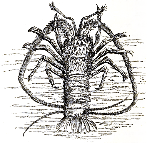 The coral reefs fringing the island of Mauritius afford shelter to members of the family of Palinurus, which in both size and splendour of colouring far excel those taken in our seas. Some we had an opportunity of examining when freshly caught, by the fishermen of that fertile isle, looked so much like works of art that we could almost fancy Pallisey, that king of potters, must have returned to life, and that these were some of his choicest productions. Some were of delicate sea-green banded with white and ultra-marine blue, alternately. Others were striped with pale yellow, black, and green, whilst all were so highly glazed, and carried such a brilliant polish, that we deeply regretted the perishable nature of living things, and sighed as we reflected on the waste of so much loveliness on the more than half-heathen crew of Malabar coolies who grinned and chattered round the captives, and who had no appreciation whatever for crustacean perfection, except in association with rice and a brass cooking-pot.