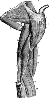 On the other hand, as impossible combinations discordant both to sentiment and muscular mechanism, we may, for example, consider the simultaneous contraction of the frontalis and the superior orbital portion of the orbicularis muscles of the eyelids. The first muscle expresses attention, the second reflection, or two opposite states of the mind, which cannot at the same time be open to external phenomena, and meditating on internal analyses. Again, the first muscle raises, the second depresses the eyebrow, which cannot be at the same time drawn in two opposite directions; just as, to take an example from the muscles of the limbs, the forearm cannot be at the same time flexed by the action of the biceps and extended by that of the triceps.