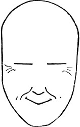 Figure 101, representing the contraction of the great[326] zygomatic muscle, illustrates in a diagram the frank expression of gaiety and laughter, and we see that the alterations of expression take place only, as we have already said, in the line of the lips, the naso-labial line, and the external angle of the eyes.