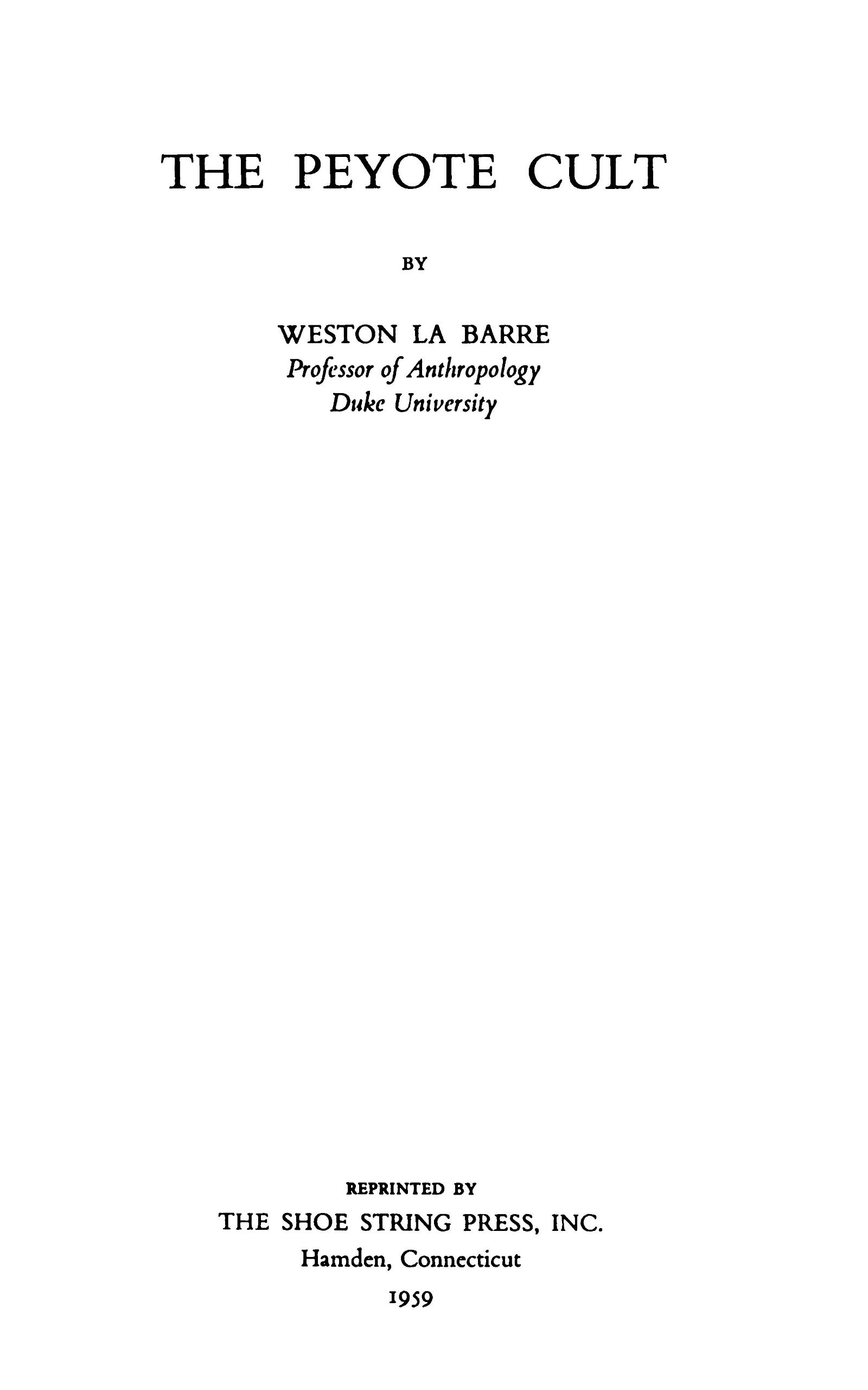 Praying and doctoring in meetings, and occasionally public confession of sins, are the major means for the liquidation of life-anxieties of this profoundly functional cult’s many present-day communicants. In the following pages we shall attempt to delineate the history of the study of the cult, the various botanical questions surrounding peyote, its physiological action and the various ethnological, psychological and historical questions involved in its diffusion.