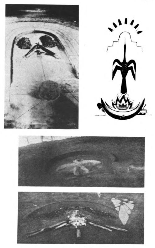 Plate 2. Altar and ash-birds. Upper left, Quapaw permanent cement altar of the John Wilson Big Moon rite. The ash mounds are the “graves” of John Wilson and Jesus Christ; the W’s or M’s on each side of the heart signify “Moon-Head” or “Wilson.” The nearest heart of the mound is the Heart of the World, that under the fire the Sacred Heart of Christ, that on the moon the Heart of Goodness on which the father peyote rests. Seven lines around the apron represent week days, the twelve lines the months of the year. The ashes mean the parting of the Red Sea, or mean to some the sheep and the goats. This altar was made by the authorised builder, Victor Griffin, and his assistant, Charley Tyner. Upper right, Symbolic peyote painting by Mopope (Kiowa) showing sacred staff, seven-marbled drum, drumstick, gourd rattle, doctoring feathers, and altar or moon with ash crescent. The water bird intermediary is carrying a prayer from the father peyote on the altar across the ritual fire to the great spirit indicated by the seven rays of feathers of the rising sun. The lightning lines from the god-head result from the artist’s visits to the Southwestern pueblos. Center, A fine example of the scissors-tail ash bird made at an Oto meeting near Red Rock, Oklahoma. Lower, An unusually fine example of the water bird ash bird made at a Shawnee meeting near McCloud. The burnt sticks finish out the scissors-tail of the bird. The smokestick in the foreground is carved with native and Christian symbols (now in Peabody Museum, Harvard University). (It is believed that the Yuchi altar of Petrullo, Plate 2, is erroneously figured and is of the order of those shown here.)