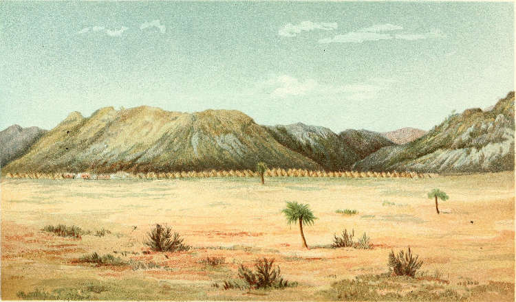 [42] The coloured drawing opposite illustrates the position of the town of Shoshong (Bamangwato). In front stretches a dry sandy plain, the native huts collected under the shelter of the mountains, which afford an easy refuge in times of warfare. The huts and stores of a few English traders, built of wood or clay, are seen grouped together at one extremity of the town—to the left hand. The only water in the dry season, as mentioned in a previous chapter, is got from a small stream up the gorge behind the town, some distance off, whence it is taken to the town in small vessels upon people’s heads. In this gorge stand the church and mission station of the London Missionary Society, from which are seen a short way off the beehive-like huts of Shoshong on the plain; see the woodcut at page 149.