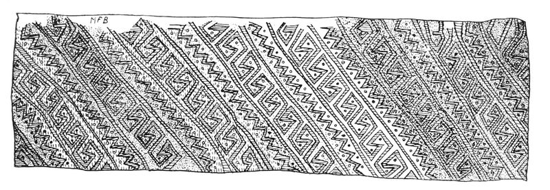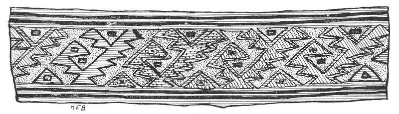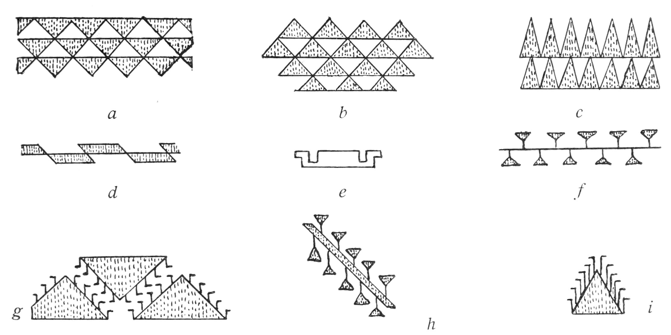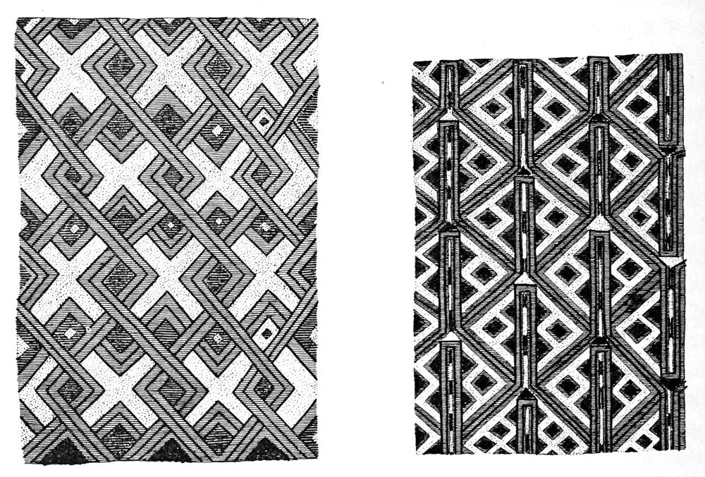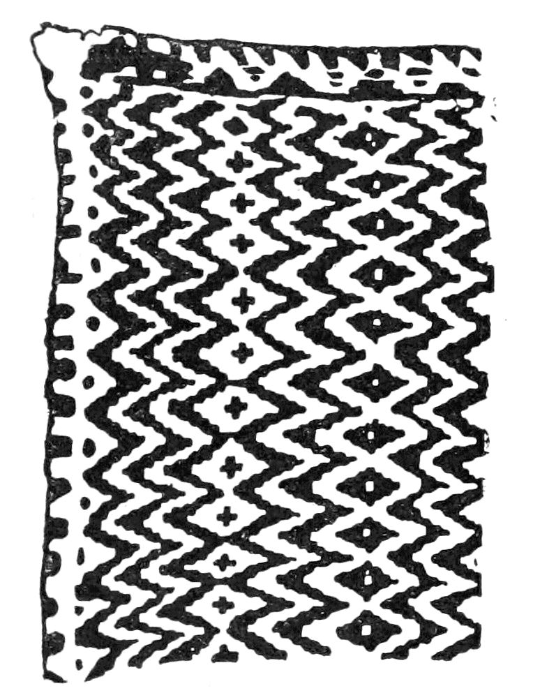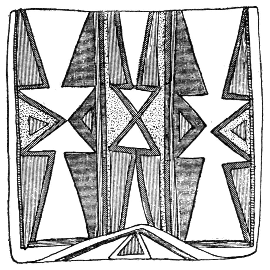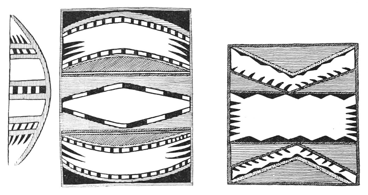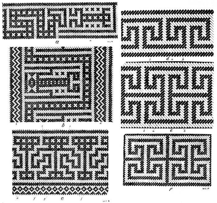 Alfred C. Haddon[12] and W. H. Holmes[13] seek the origin of all decorative art in realism. They discuss the transfer of technical forms to ornament but they see in these also results of the endeavor to reproduce realistic form, namely; technical details. Henry Balfour[14] agrees, on the whole, with this position but he stresses also the development of decorative motives from the actual use of technical processes.