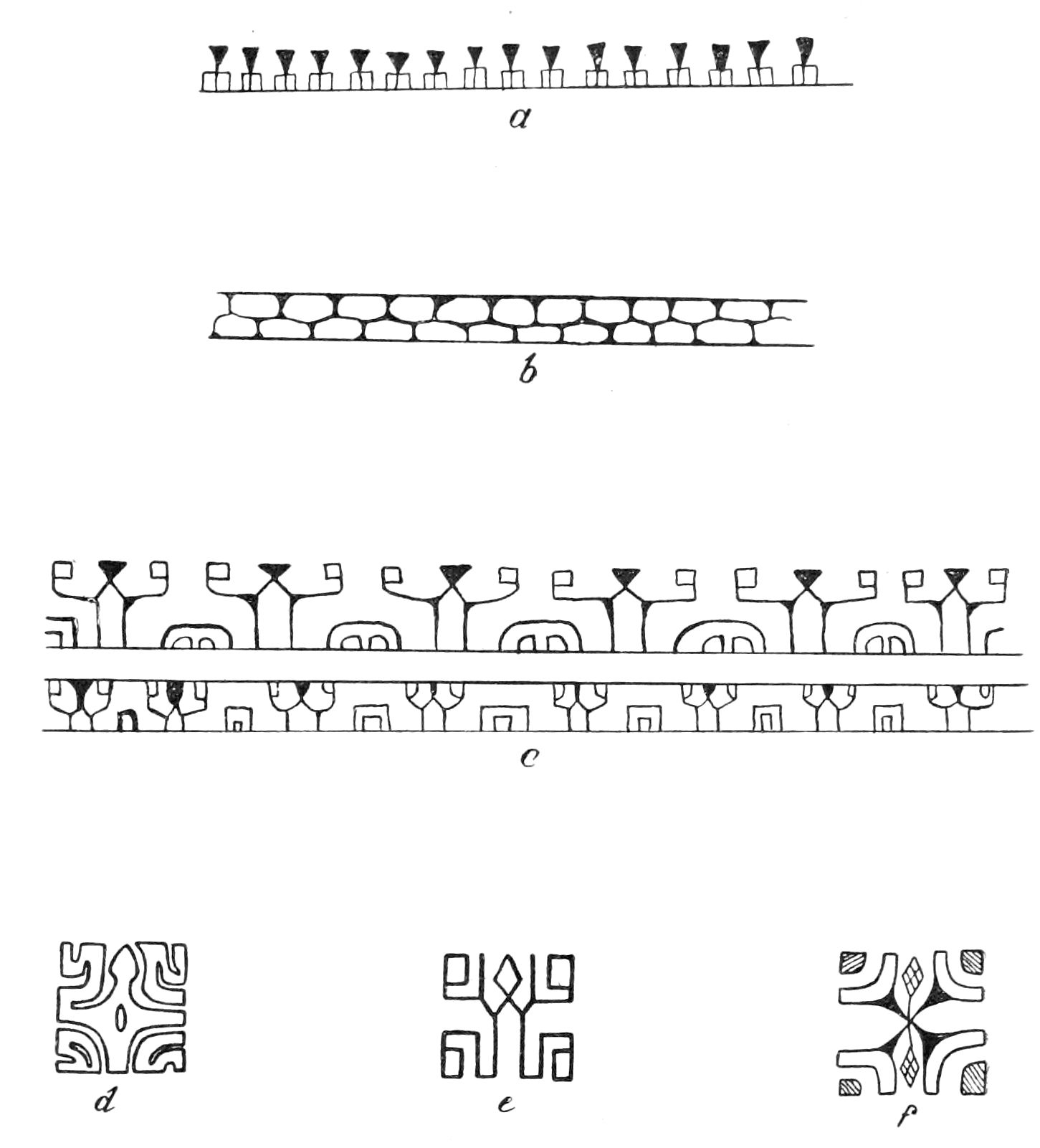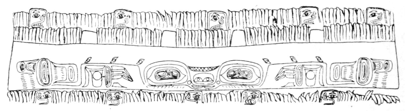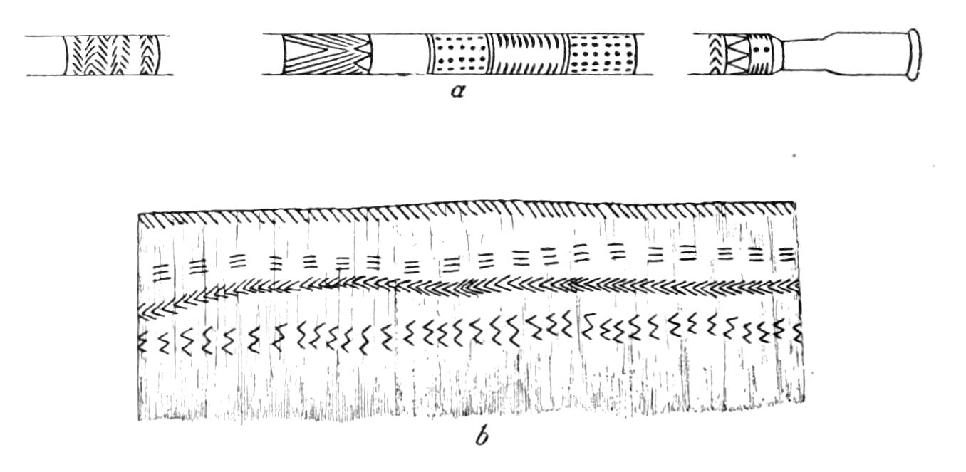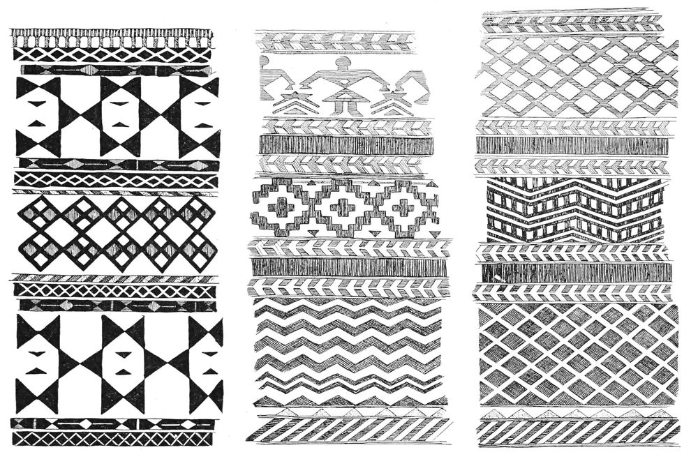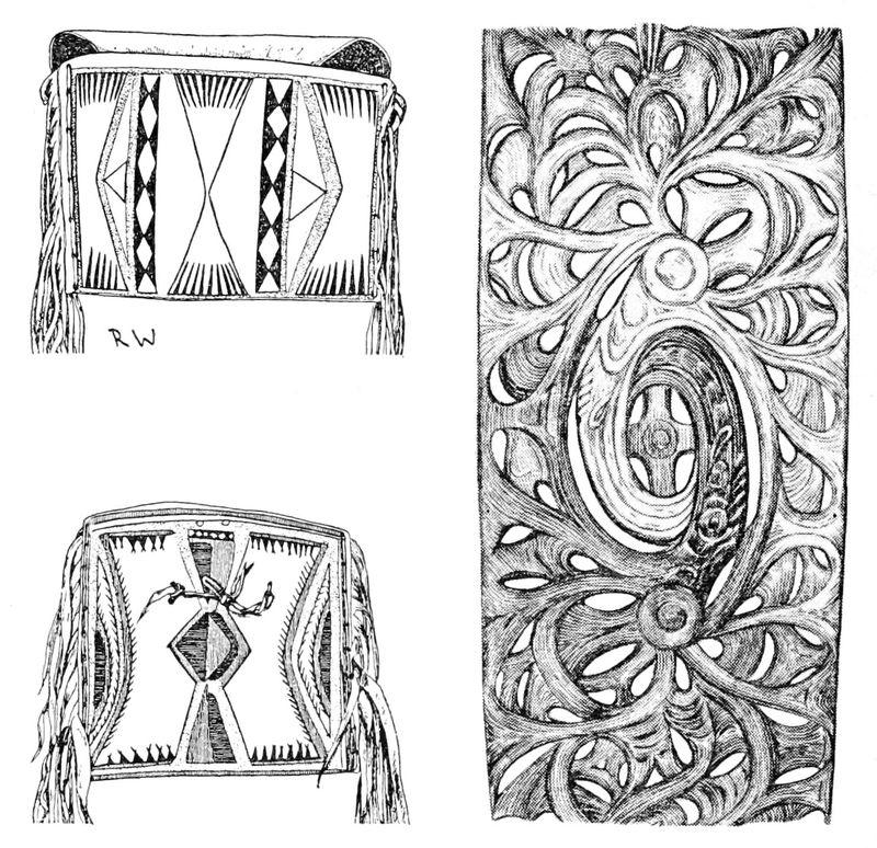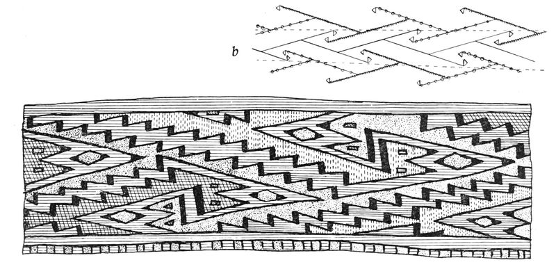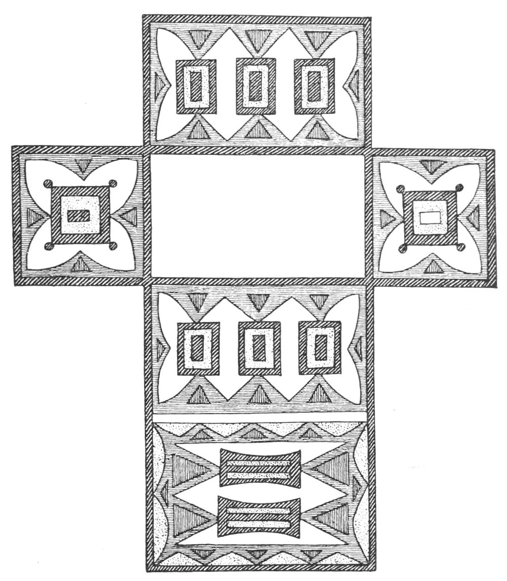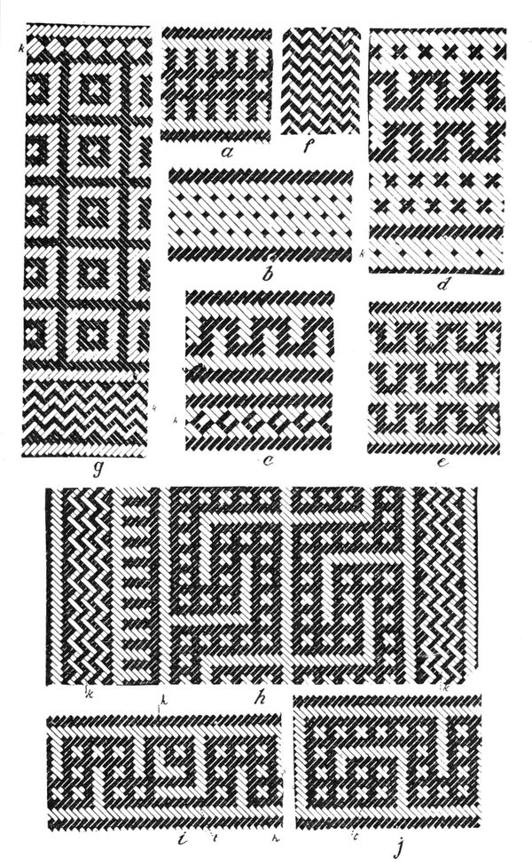 Alfred C. Haddon[12] and W. H. Holmes[13] seek the origin of all decorative art in realism. They discuss the transfer of technical forms to ornament but they see in these also results of the endeavor to reproduce realistic form, namely; technical details. Henry Balfour[14] agrees, on the whole, with this position but he stresses also the development of decorative motives from the actual use of technical processes.