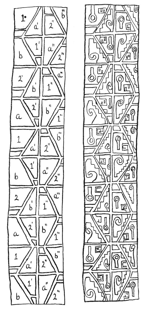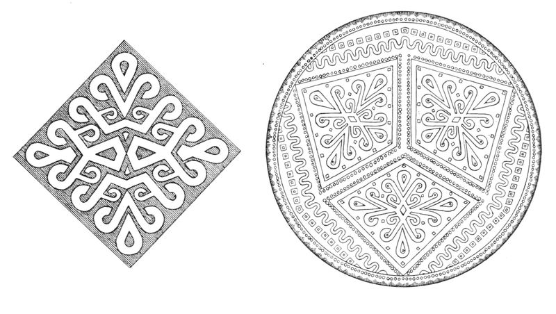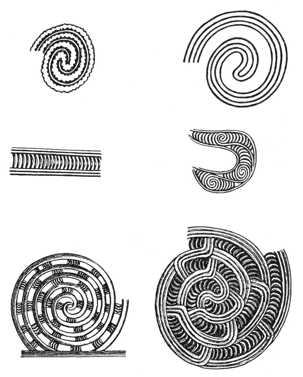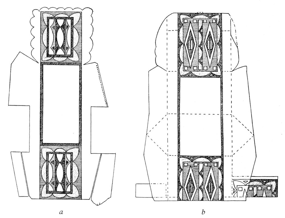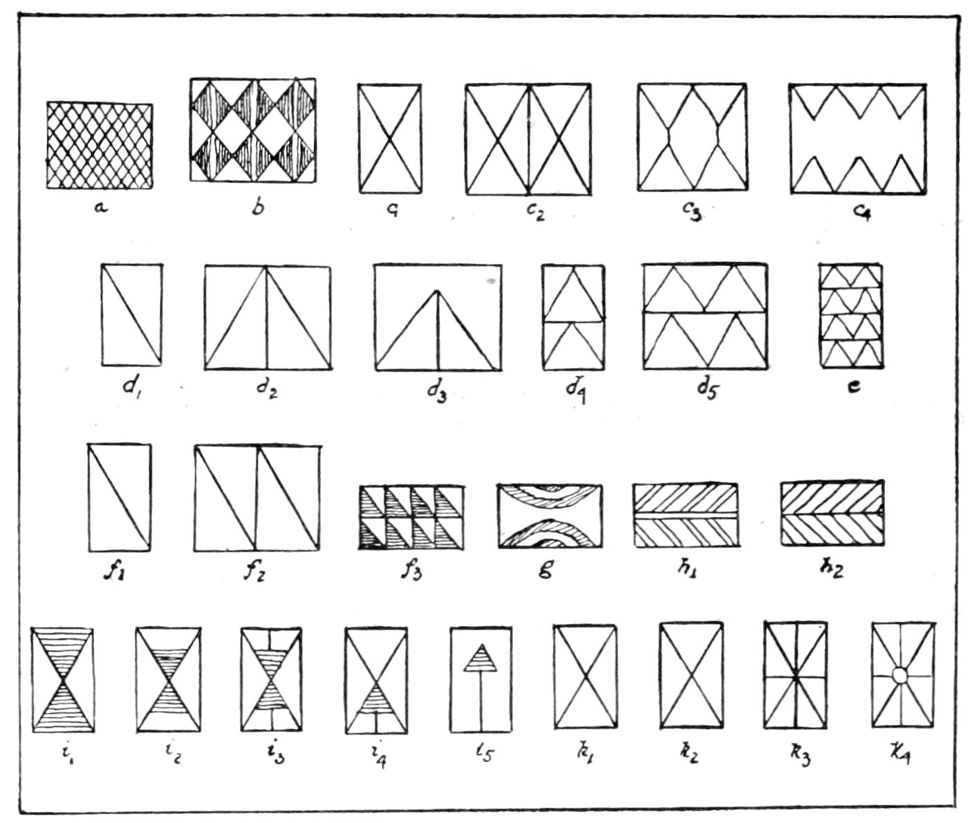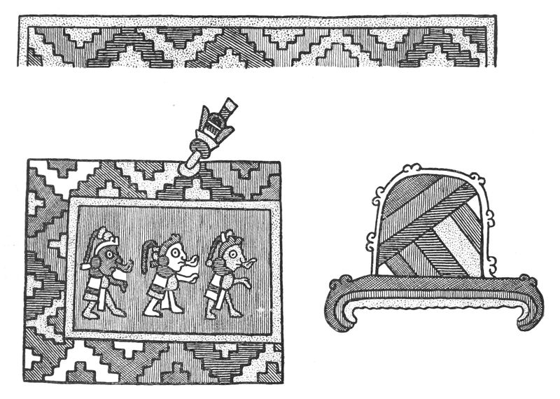 Alfred C. Haddon[12] and W. H. Holmes[13] seek the origin of all decorative art in realism. They discuss the transfer of technical forms to ornament but they see in these also results of the endeavor to reproduce realistic form, namely; technical details. Henry Balfour[14] agrees, on the whole, with this position but he stresses also the development of decorative motives from the actual use of technical processes.