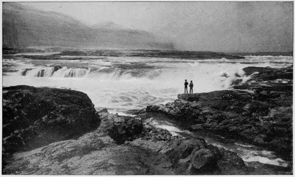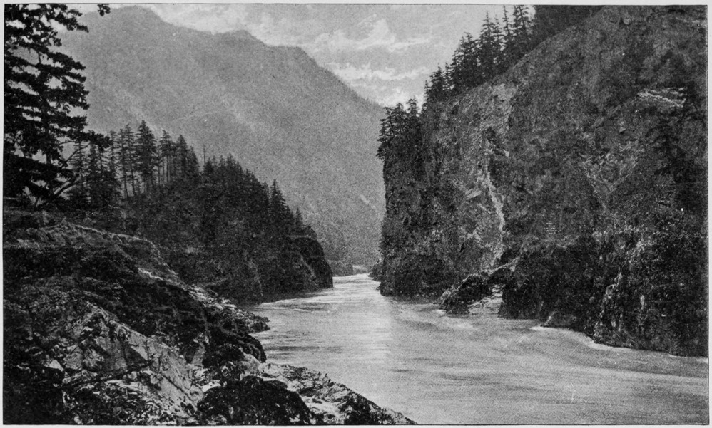 There are a few shallow places where one can see logs and dead trees lying at the bottom; but generally the small river is wonderfully deep, so that it seems more like the arm of a lake than a mountain stream. [270]Below the falls, however, it becomes too shallow and turbulent for navigation, and this suggests the theory that the cascades and falls were caused by a landslide, or rather a rockslide, which blocked up the river and deepened the part above this obstruction.