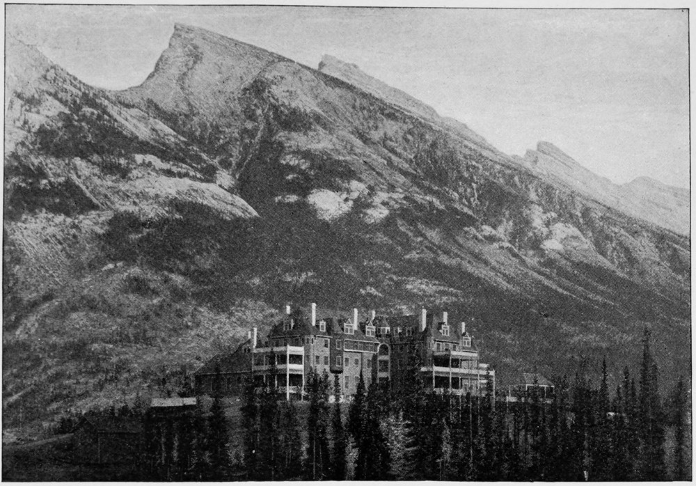 It was Goethe, I believe, who spoke somewhere of the pleasure of arriving at a place famed for its beauty, in [268]the darkness of night, thus reserving for the morning hours, when our senses are refreshed by sleep, the first impressions of the scenery. Passengers who have not “read up” on the subject, would little imagine, as the midnight coach takes them to the Canadian Pacific Railway Hotel, as it is called, that they are in some of the finest mountain valleys in the world, and that the hotel itself is as picturesquely perched on top of a hill as any castle on the Rhine. But no castle on the Rhine boasts a view comparable to that which is spread before them in the morning. The best place to enjoy it is in the open rotunda built behind the hotel, just over the precipice. Far below, the clear and rapid Bow River winds along in graceful curves, forming on the left a series of turbulent cascades terminating in a fall which is visible from the rotunda, though of course at this distance less effective than from the river-bank. Below the falls the river hastens on in the direction of the Peechee Mountain, which forms the boundary wall of the valley east of the hotel and, with the wide ridge on the right, is the most interesting sight in the whole Park. This ridge seldom presents the same appearance on successive days, and hardly two photographs of it are alike, owing to the fact that the melting snow, after a storm, constantly stripes and mottles it in different patterns. Though the ridge, which is several thousand feet wide, seems to be absolutely perpendicular, the snow still clings to it and paints it white, except in one section, near the summit, where a black, snowless streak runs across horizontally, dividing the snow-wall into two sections.