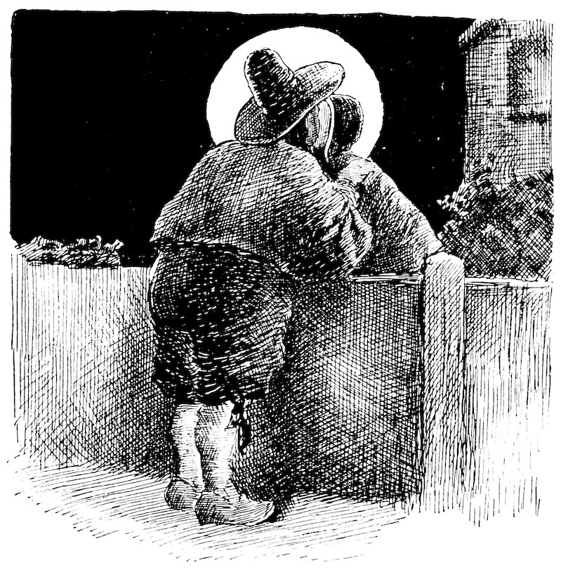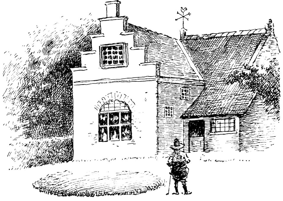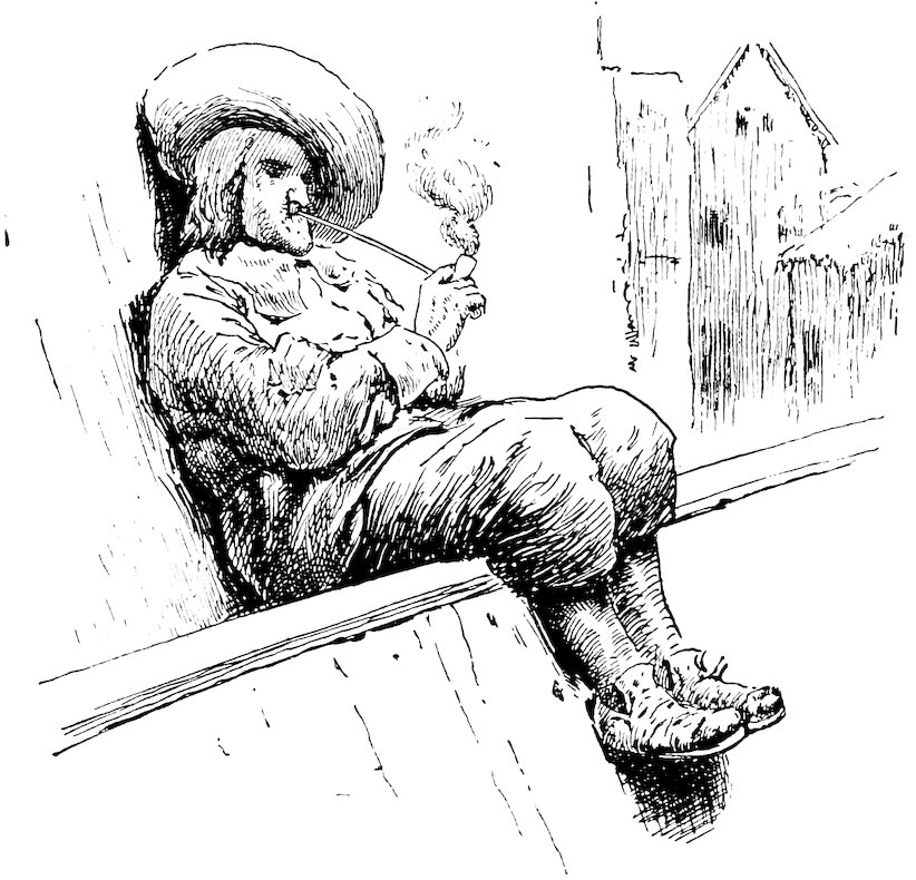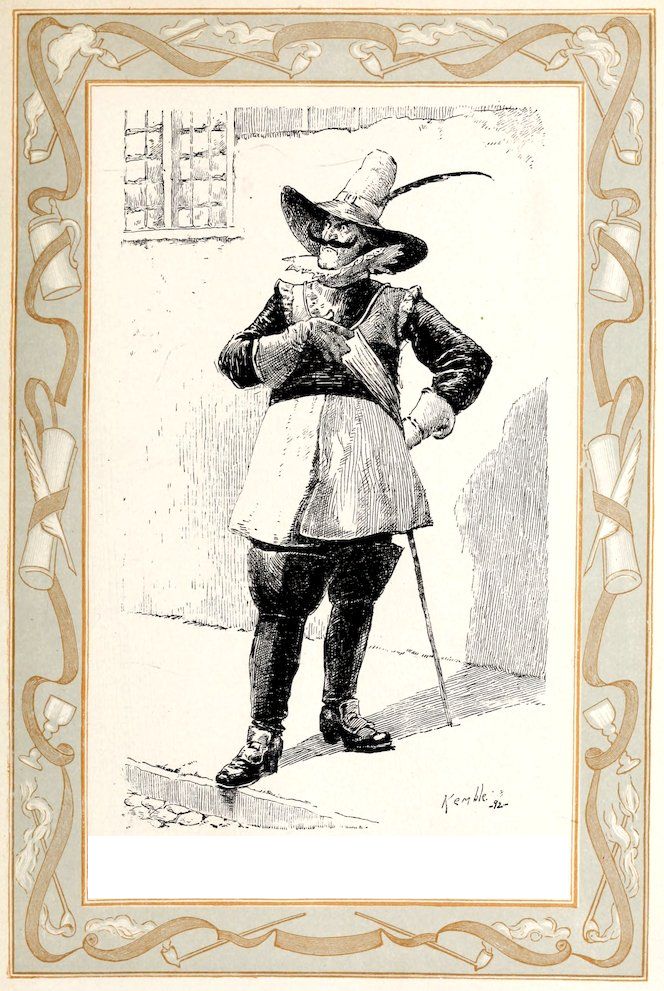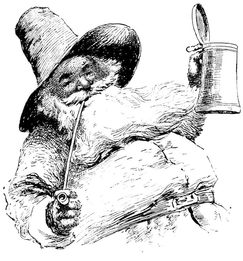 This sounder of brass was moreover a lusty bachelor, with a pleasant, burly visage, a long nose, and huge whiskers. He had his little bowerie, or retreat, in the country, where he led a roistering life, giving dances to the wives and daughters of the burghers of the Manhattoes, insomuch that he became a prodigious favorite with all the women, young and old. He is said to have been the first to collect that famous toll levied on the fair sex at Kissing Bridge, on the highway to Hell-gate.[35]