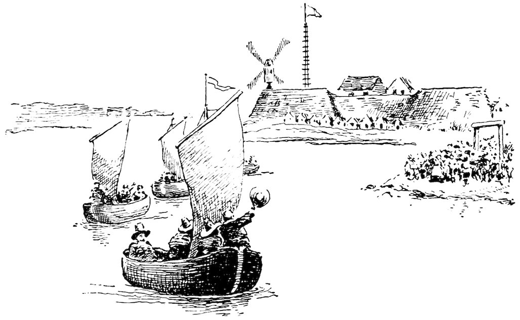 At length, one day the inhabitants of New Amsterdam were aroused by a furious barking of dogs, great and small, and beheld, to their surprise, the whole garrison of Fort Goed 338Hoop straggling into town all tattered and wayworn, with Jacobus Van Curlet at their head, bringing the melancholy intelligence of the capture of Fort Goed Hoop by the Yankees.