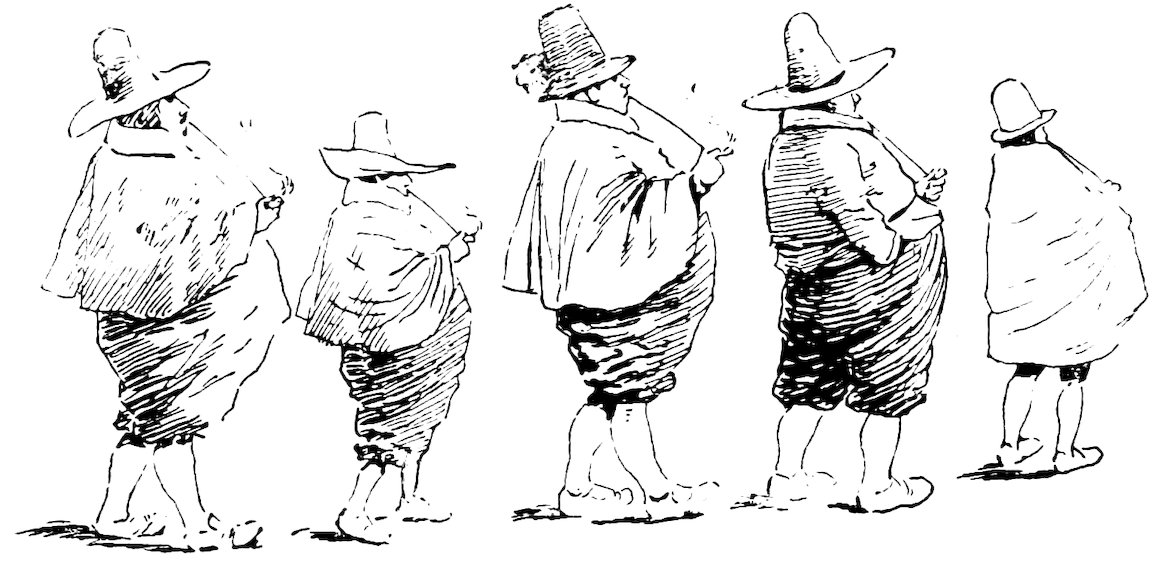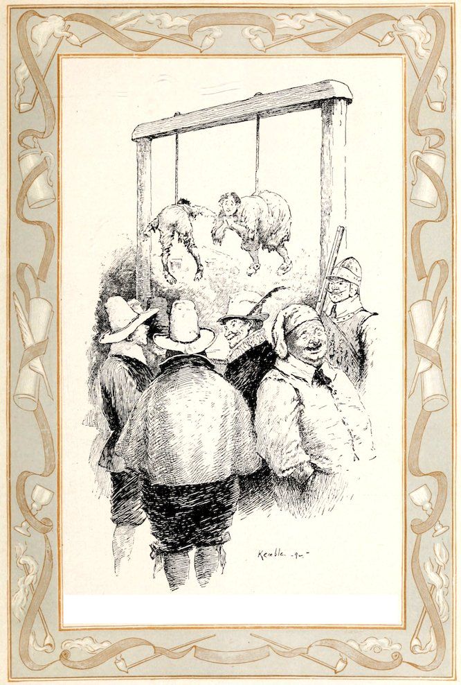 It is incredible how the little governor chuckled at beholding caitiff vagrants and sturdy beggars thus swinging by the crupper, and cutting antic gambols in the air. He had a thousand pleasantries and mirthful conceits to utter upon these occasions. He called them his dandelions—his wild-fowl—his high-fliers—his spread-eagles—his goshawks—his scarecrows—and finally, his gallows-birds; which ingenious appellation, though originally confined to worthies who had taken the air in this strange manner, has since grown to be a cant name given to all candidates for legal elevation. This punishment, moreover, if we may credit the assertions of certain grave etymologists, gave the first hint for a kind of harnessing, or strapping, by which our forefathers braced up their multifarious breeches, and which has of late years been revived, and continues to be worn at the present day.
