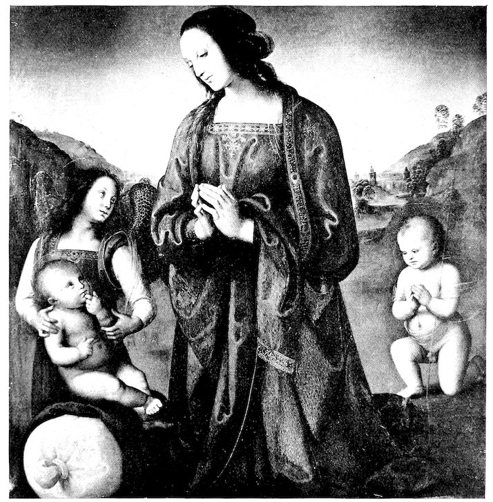 And now Perugia and Urbino become central to the art of Italy. Pinturicchio, Perugino, and Raphael rule the time, and the time is a great one. Perugino may not be to us all that criticism held him to be in the time of reaction against the love of the Carracci—who were the greatest (as well as the latest) of all the Italians, in the grotesque opinion of Horace Walpole. On its way back to the older Florentines, the taste of the dilettante paused upon Pietro Perugino as on a master comparatively early, tender, spiritual, and candid. It was a higher thing to admire the recollected and feminine attitude of a saint of his under a blue sky than the muscular action of a saint of Guercino’s against a convention of cloud; and the little tree of the Umbrian background than the gloomy Neapolitan’s twisted forests. And with this master of Raphael is Raphael’s father, Giovanni Santi, contemporaries together, and heralds and forerunners of the painter 63whom nearly all men love to praise. In relation to children Giovanni Santi seems to be memorable chiefly by reason of a little girl, a daughter of donors, set on her knees in front of her father and mother to offer her devotions to the Bambino of a pale Madonna—a Bambino having nothing remarkable, granted the time and school. But this little girl in her close cap, who is evidently there because the pair behind her have no son, is purely childlike, and kneels, like a child, on both knees, simple and erect, her hands before her and the soles of her feet behind her, under her little sombre petticoat. Santi’s angels are much like those of Balducci, if Balducci it be—winged heads of veritable children making a crown. Their roundness is here in contrast with the worn and patient Saints, a wrinkled Saint Francis of Assisi showing his transfixed hands, Saint John the Baptist hollow-cheeked, Saint John the Evangelist in extreme old age (we must suppose that the donor’s name is John, like the painter’s); and Saint Sebastian only of the four is young, and his whole body is pierced with arrows. Of Perugino’s many Bambini none has more sweetness than the Child whom a young angel has placed on a cushion so that the Virgin’s hands, released from their burden, might be folded. To some charming angel, almost feminine in action, many a master has given this office, making of the heavenly youth a little nurse for a time, so that the maternal knees, all day long the throne of Christ, may be bent and press the earth like those of all mankind. The Child here has the beauty of a direct look, meeting the Virgin’s eyes, and his hands have the action of a child; hardly so the boy Saint John with his light cross against his shoulder, daintily kneeling upon one knee.