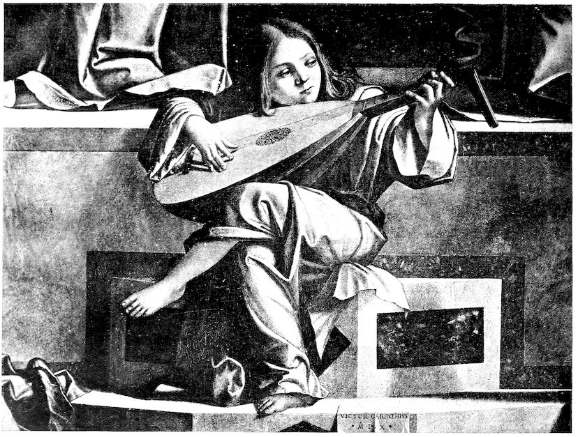 Younger, more childlike, and nearer to nature than the young adolescent angels of contemplation are the little musicians. They are less smooth, more active, and busy with their strings. The players and singers of the earlier masters produced their music with an angelic ease and carelessness of method; but the child of the later school is industrious and able. He is the pleasant fiction of a day in which simple action had begun to amuse or attract the painter’s eye, in which the pencil paused with pleasure upon the way of a player with a lute and the incidents of the fingering. To feign the musicianly activity of a little child, to bend a babe’s hand to the strings or to put his small mouth to the recorders, was a game that 45pleased the fifteenth-century in Italy; it was such a mixture of realism and miracle as took the fancy of the time. One is reminded of the distant, different northern fancy, the mixing of observed fact with a pathetic convention in the insanity of the tragic stage, the sweetness of an innocent intelligence astray, the favour and the prettiness of the distracted woman. Carpaccio, Bellini, Bonifazio Veronese, Fra Bartolommeo, Frate Antonio the Olivetan, Rosso Fiorentino, are but a few of the painters, major and minor, who have put instruments into these infant hands; gross hands of natural-unnatural putti are some of them, and some again are animated with an eager grace. Frate Antonio gives to one fleshly babe (standing with one bent leg, for elegance) a triangle, and to another a flute; Bonifazio puts a large lute into the round arms of a winged musician; Raphael (in the “Madonna del Baldacchino” at the Pitti Palace) gives to two corpulent little boys, in attitudes both adult and effeminate, a scroll to sing from; Rosso gives us a sudden delight in the impetuous head of his angioletto with the cheek pressed upon the lute, the mouth close to the strings, the wings erect and the wild hair; Fra Bartolommeo makes his beautiful winged boy, in the cathedral at Lucca, a singer to his lute; Carpaccio’s middle child in the “Presentation of Christ,” one of the loveliest figures in Venetian art, is intent upon his lute.