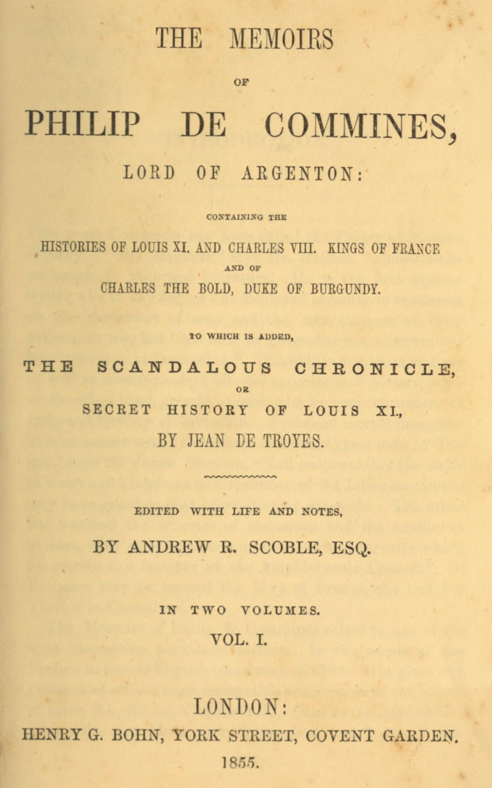 Containing the histories of Louis XI. and Charles VIII. Kings of France, and of Charles the Bold, Duke of Burgundy. To which is added the Scandalous Chronicle, or, secret history of Louis XI., by Jean de Troyes.