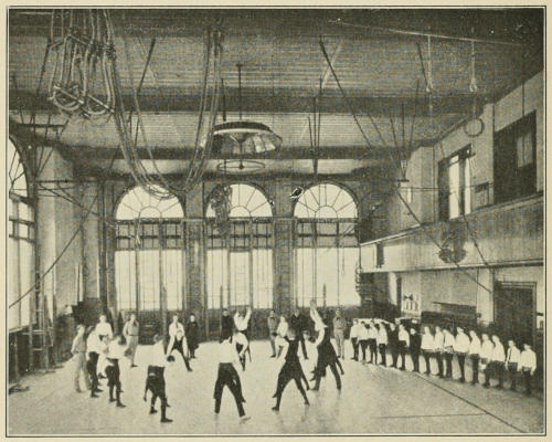 At Wood Island Park, in East Boston, another outdoor gymnasium and playground, nine acres in extent, was opened September 6, 1895. Men were admitted on four days of the week, and women on two. Beginning in 1896, and with the effective coöperation of Mayor Josiah Quincy (1895-1899), there was a rapid expansion of public facilities for recreation of all sorts in and about Boston, [342]including playgrounds, indoor gymnasia, beach baths, floating bath-houses, swimming pools and all-the-year baths, and provision for skating and coasting in winter. This whole series of progressive steps is outlined in Joseph Lee’s “Constructive and Preventive Philanthropy” (New York, The Macmillan Co., 1902), along with corresponding steps in other cities, and details will be found in reports of the Boston Park Commissioners, the Boston Department of Baths, and for the North End Playground the instructive annual reports of the Massachusetts Civic League (after 1900). The first municipal indoor gymnasium was the East Boston (Paris Street) building, a one-story, truss-roofed structure 137 by 98 feet, with a main hall 100 by 80 feet. Originally a skating rink, it was purchased by Esther P. (Mrs. Daniel) Ahl and turned over to the East Boston Athletic Association for use as a combined gymnasium and bath, and in 1897 given to the city and opened to the general public. The South Boston (D-Street) gymnasium, the first to be built by the city, was opened in the winter of 1899-1900.
