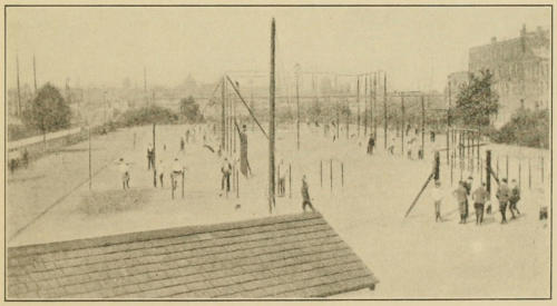 The men’s gymnasium, surrounded by an iron fence, was reached only from the upper story of one of the houses just mentioned, [340]connected with the grounds inside by a bridge on which turnstiles were placed, for registering attendance. The equipment, designed by Dr. Sargent of Harvard University, consisted of two sheds with twelve sets of chest-weights in each, including six high and six low pulleys, “two giant-strides, eight sets of horizontal bars, eight sets of parallel bars, six jumping-boxes, seven boxes for quoit-pitching and shot-throwing, two sets of jumping standards and ropes, two sets of sandbags and attachments, four vaulting poles, three shots, two heavy weights, twenty-four quoits, twenty pairs of dumb-bells, ten sets of hurdles, and two large frames, each 160 feet long, to which are attached the following apparatus: four balance-swings, eight breast-bars, four single swings, two double swings, five swinging-ropes, one rope ladder, one iron Jacob’s ladder, one perpendicular ladder, one inclined ladder, four pairs of flying rings, four single trapezes, one climbing-pole, two inclined poles, two perpendicular poles. Around the outside of the ground there is a running and bicycle track 15 feet wide and ⅕ mile long.” The men’s grounds were opened to the public on August 27, 1889, in charge of Superintendent John Graham, and the next season extended from April 1 to about the middle of December, an average of 447 men and boys a day entering for use of the apparatus during this period. In May of 1891 thirteen electric arc-lamps were added, and thereafter the gymnasium was kept open until 9.30 P.M. The total number of visitors this year was 169,219, and on the three days showing the largest attendance the turnstiles registered 1649 (May 3), 1480 (July 30), and 1572 (July 31) admissions.