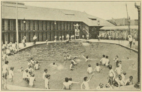 “Small park and playground development in Chicago is even more remarkable because of its unique character than because of its [345]extent. The assemblage of functions represented in the small park-playgrounds which we have been considering is a new thing in the world, and its creation three or four years ago by the South Park Commission was an event of civic imagination and adventure of which Chicago is worthily proud. A typical center includes both outdoor and indoor activities. The outdoor activities comprise as the central feature a liberally planned bathing pool, with sandbanks, dressing rooms, cleansing showers, life-guards and bathing suits. Collateral to this are an outdoor gymnasium for men, another for women, another for boys, another for girls, running tracks, wading pools, and sand courts for the youngsters; also tennis courts and ball fields—turned into skating rinks in the winter time. The interior features include a thoroughly equipped gymnasium for men, another [346]for women, each having a trained director and being furnished with baths and lockers, a lunch room, reading and library room, one or two small club rooms for small gatherings, and a large and beautiful assembly hall for neighborhood meetings, lectures or pleasure parties. The entire construction is on a liberal plan and is carried [347]out in accordance with high standards. So is the maintenance....”