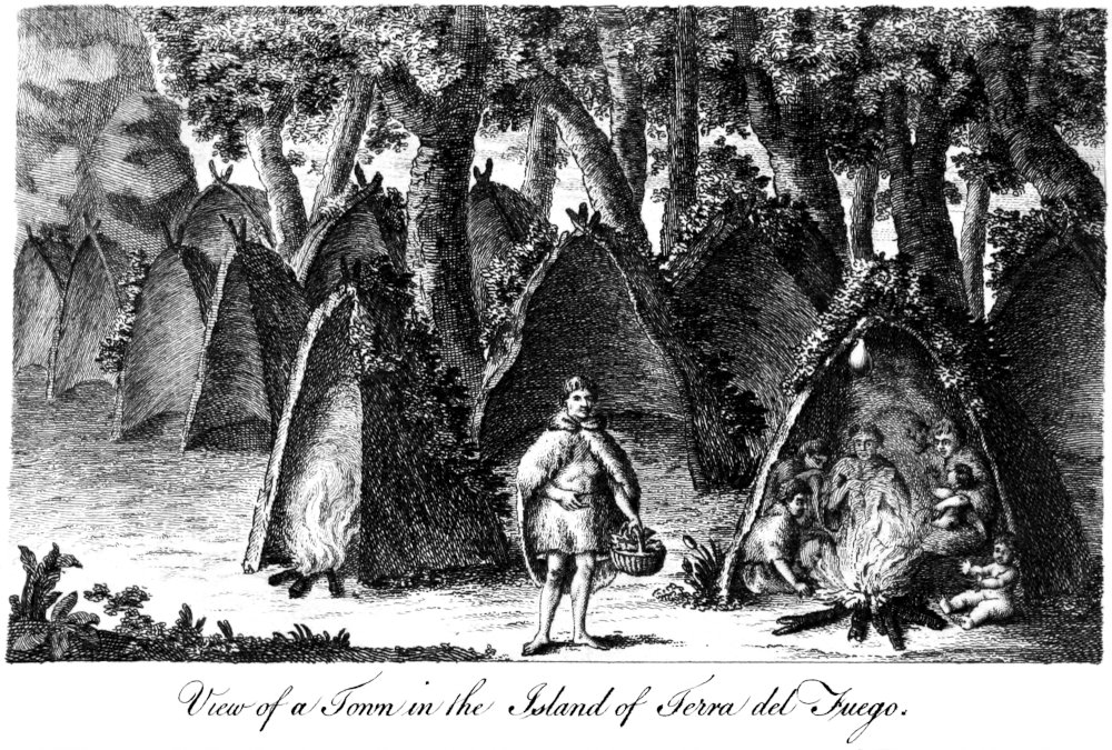 While the ships lay at anchor here, Mr. Byron and a party went on shore; but being catched in a violent rain, they stopped where some Indians had left a fire, the wood of which was yet warm; and kindling a fire to dry their 15cloaths, another fire was instantly made on Terra del Fuego, the opposite shore, which they imagined to be a signal, on a supposition they were Indians. The hills were craggy, of an amazing height, and wholly covered with snow; but the plains were adorned with flowers, equal in fragrance and beauty to those in the gardens of England.