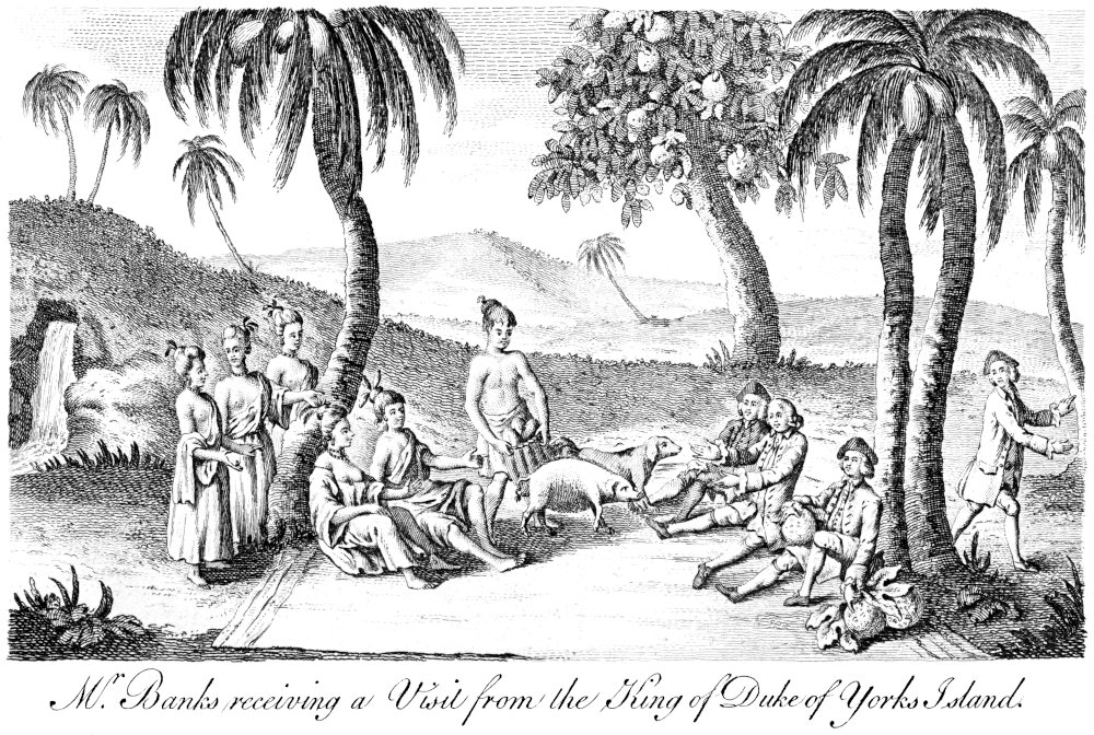 On Tuesday, when near the shore, they saw very large columns of smoke rising from the low-lands. This day they gave name to Cleaveland Bay, the east point of which was called Cape Cleaveland, and the west Magnetical Isle, because the compass did not traverse well when they were near it. The points, as well as the main land within them, lay high, and form a barren, rugged and rocky coast. On the afternoon of Thursday they saw several large columns of smoke, likewise some canoes, and several natives, with some trees, that they thought were those of cocoa-nut; in search of which fruit Messrs. Banks and Solander went 426ashore with Lieutenant Hicks; but they returned in the evening with a few plants, which they had gathered from the cabbage palm, and which had been mistaken for the cocoa-tree. On Friday they gave the name of Point Hillock to a point of land; between which and Magnetical Isle the shore forms Halifax Bay, which affords shelter from all winds. At six this evening they were a-breast of a point of land, which was named Cape Sandwich, near which lies Rockingham Bay. Hence they ranged northward along the shore, towards a cluster of islands, on one of which about forty men, women and children were standing together, and looking at the ship with a curiosity never observed among these people before. The north point of Rockingham bay was called Dunk Isle, which is scarcely to be distinguished from the shore, it lies so very near it. On Saturday morning they were a-breast of some small islands, which were named Frankland’s Isles; near which lie two places, which were called Cape Grafton and Green Island. Here Messrs. Banks and Solander went ashore with the Captain, whose chief view were to procure water, which not being easily to be got, they soon returned on board, and the next day arrived near Trinity Bay, which was so called, because it was discovered on Trinity Sunday.