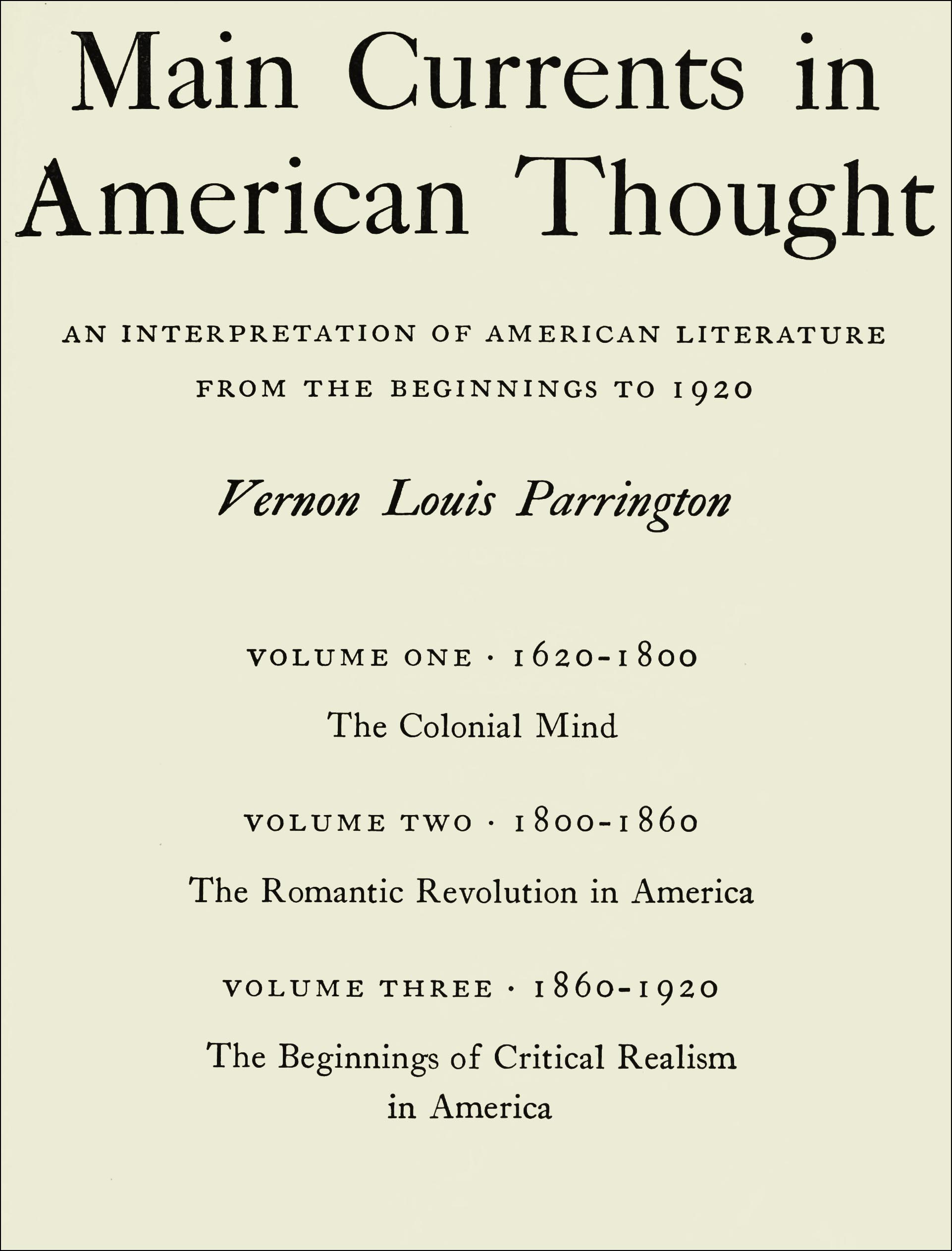 I have undertaken to give some account of the genesis and development in American letters of certain germinal ideas that have come to be reckoned traditionally American—how they came into being here, how they were opposed, and what influence they have exerted in determining the form and scope of our characteristic ideals and institutions. In pursuing such a task, I have chosen to follow the broad path of our political, economic, and social development, rather than the narrower belletristic; and the main divisions of the study have been fixed by forces that are anterior to literary schools and movements, creating the body of ideas from which literary culture eventually springs. The present volume carries the account from early beginnings in Puritan New England to the triumph of Jefferson and back-country agrarianism. Volume II concerns itself with the creative influence in America of French romantic theories, the rise of capitalism, and the transition from an agricultural to an industrial order; and Volume III will concern itself with the beginnings of dissatisfaction with the regnant middle class, and the several movements of criticism inspired by its reputed shortcomings.