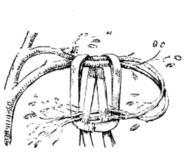 The hook of the hoisting tackle is then passed through the end of the two ends of the front sling and under the centre of the back sling.