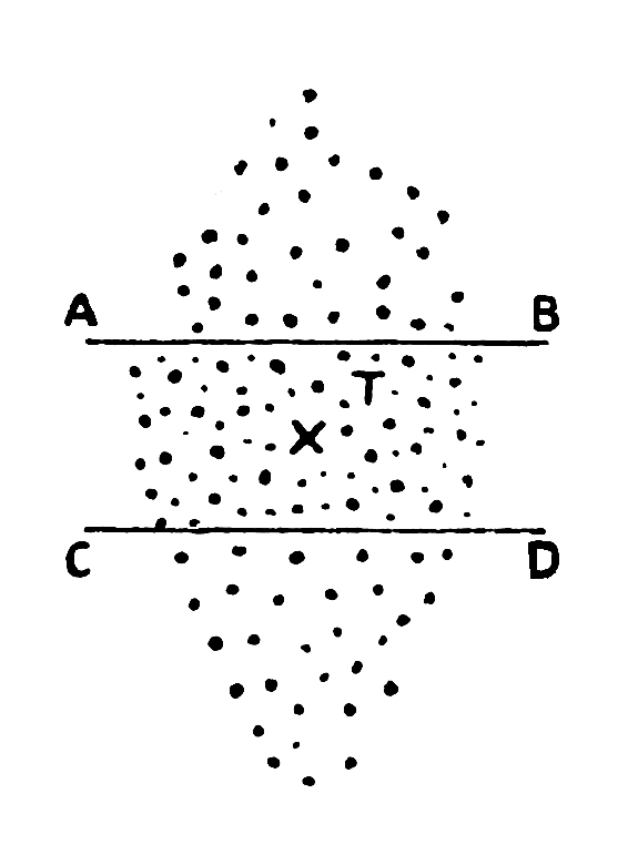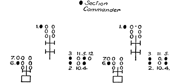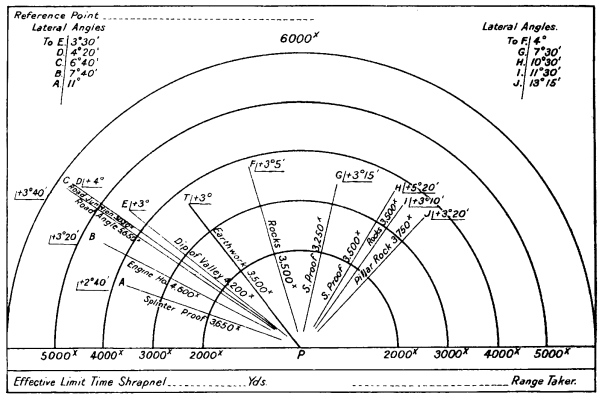 [39] —Battery commander has now corrected his lines and has established a “belt” of fire parallel to the front of his guns, through which the infantry must pass. In this example lines are not opened out. The whole “belt” can be shifted up and down, right or left, as the subsequent movement of the enemy may dictate, and a quick rate of battery or section fire can be employed as necessary.