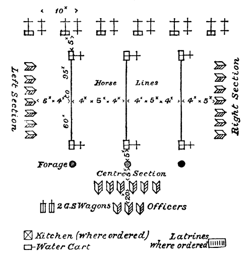 [17] In batteries armed with 4·7-inch Q.F. guns the wagons will be placed 2 yards to the left flank and 10 yards in rear of the trail eye, poles to the rear.