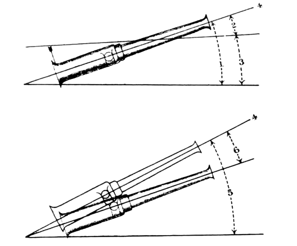 [6] “Ranging” and “Range-finding” must not be confused with one another. The latter is the measurement of the distance in yards to the target by mechanical means, and the former the process by which the elevation necessary to make a shell travel that distance is ascertained, an elevation which, owing to the various causes mentioned above, will rarely correspond with the distance given by the range-finder.