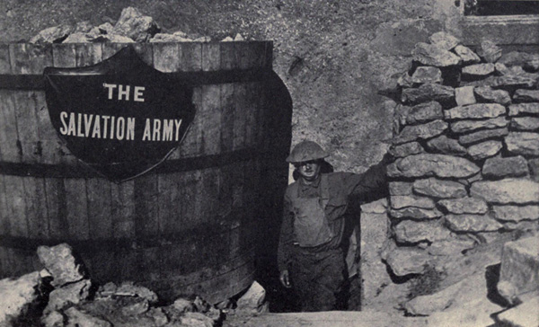 “Perhaps in the old days when war and your home town seemed as far apart as Paris, France, and Paris, Ill., you were a superior person who used to snicker when you passed a street corner where a small Salvation Army band was holding forth. Perhaps—Heaven forgive you—you even sneered a little when you heard the bespectacled sister in the poke-bonnet bang her tambourine and raise a shrill voice to the strains of ’Oh death, where is thy sting-a-ling.’ Probably—unless you yourself had known the bitterness of one who finds himself alone, hungry and homeless in a big city—you did not know much about the Salvation Army.