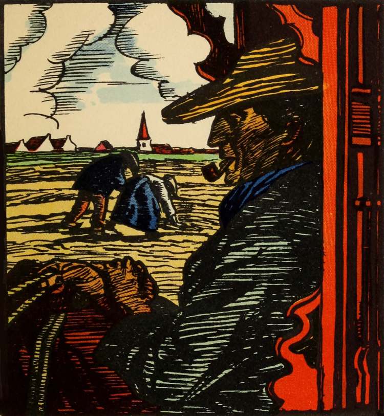 He sat down at a crowded table between a wizened, blue-bloused peasant with a cropped white head and a neck like that of a moulting parrot craning over a dingy white collar around which was tied a half-inch of black ribbon by way of cravat, and a buxom farm-wife in spotless head-gear, brilliant silk neckerchief and great gold earrings. They ate lusciously with great clatter and prestidigitation of knives, [Pg 35]and drank the little grey stony wine, and talked of crops and cattle and marriages and deaths.