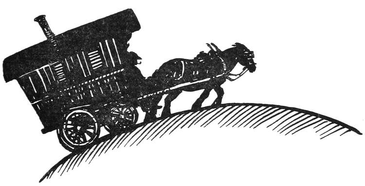 He descended the three steps, recognized that what he [Pg 6]had taken for a ship was but a sort of gipsy caravan, and that the noise was made by a tethered horse comfortably munching the wayside grass.