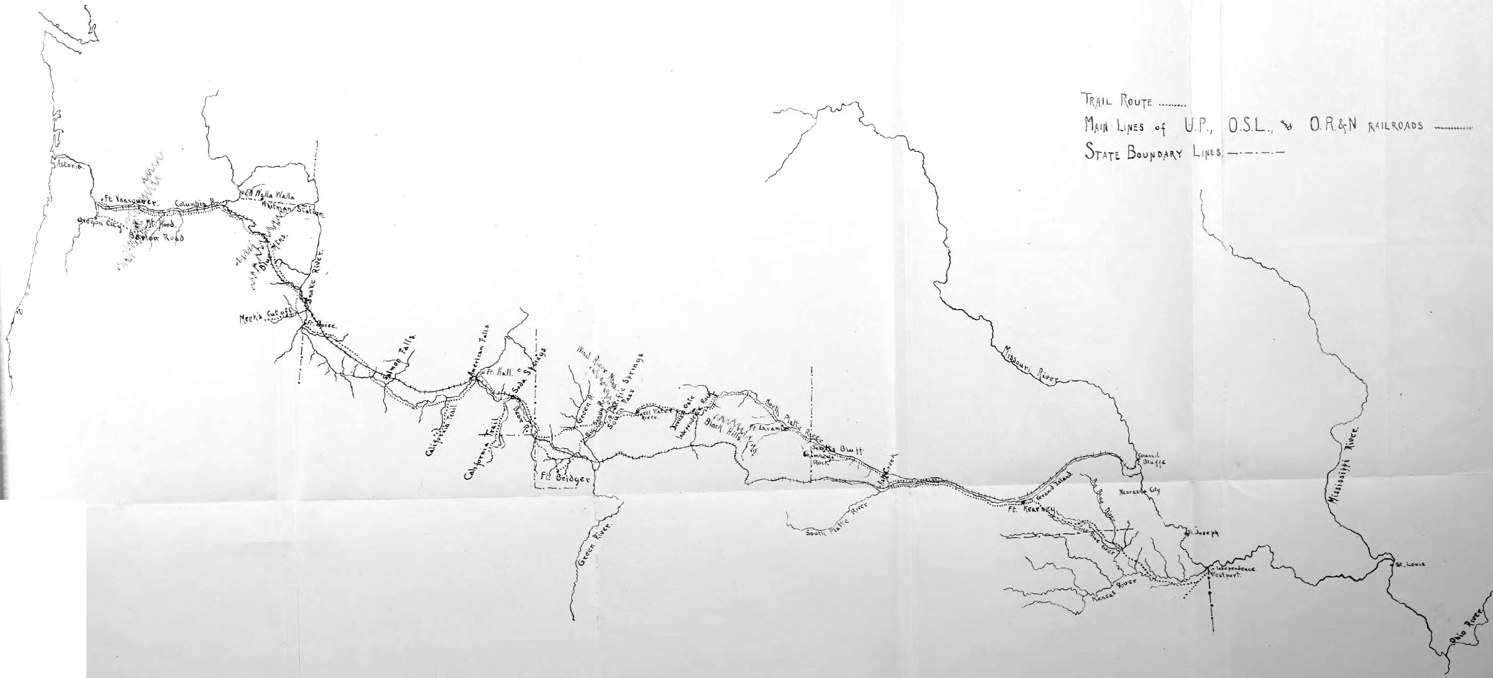 Independence and Westport, just south of the Missouri’s great bend to the east, were the gateway of the earliest regular travel and traffic across the plains. These towns are now the suburbs of Kansas City. The Oregon migrations of 1842 and 1843 were formed exclusively in this vicinity. The old Santa Fe trail led by these settlements. From these points, too, the fur trading companies conducted expeditions annually to the upper waters of the Green River beyond the Rocky Mountains. The route was up the south side of the Kansas River some fifty miles, then turning to the right, the river was forded or ferried and a general northwest course adhered to, more direct for Oregon.