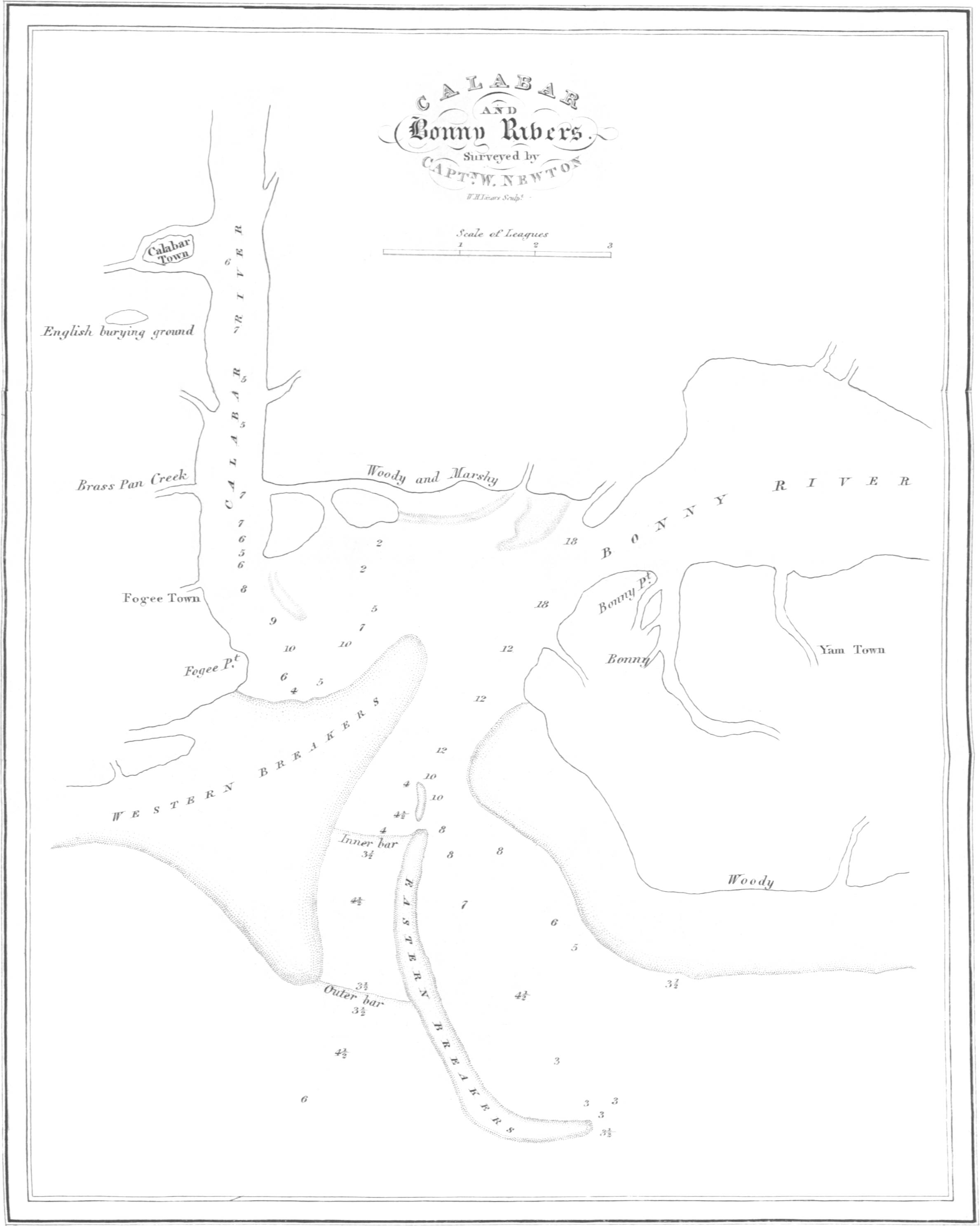 Allowing we had no positive information of the course and magnitude of the Niger lower down than Bammakoo, Sego, and Lake Dibbie, still the fact of there being such a river continuing its course eastward from the latter place, is sufficient to induce us to look for its exit on the sea coast. We are quite certain that it does not enter the sea to the north; and we may say we are equally sure that it does not finish its course in any sea to the east. To the south, therefore, we must turn our inquiries. In no part of Western or Southern Africa is there stronger grounds to look for this estuary, than in the coast below Benin. There the soil is all alluvial.[3] For a great distance into the interior, stones larger than a man’s fist are unknown. The country is flat, and inundated during the swell of the rivers from the tropical rains. The land is daily gaining on the sea from the quantity of alluvial matter brought down from the interior. The whole country and coast, for a great extent, is intersected with arms and outlets of rivers, communicating with each other inland. The bottom of the sea, along a great extent of coast, is all soft mud. From the Rio Lagos to the Rio Elrei river, no fewer than twenty streams enter the ocean, several of them of surprising magnitude, and navigable for ships. Large floating islands are borne down by their waves, and carried into the ocean. The great magnitude of these rivers will by and bye come more particularly under our review.