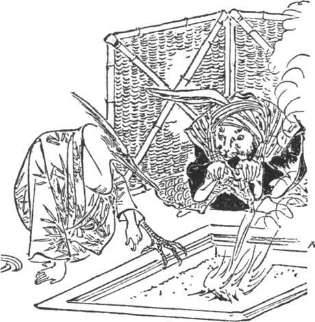 Boldog ember lett a fösvény s cserepeket, megannyiját összeszedvén, nagysietvést lohol haza, szinte ragyog örömében Jamagáta kapzsi arca. Végignézi cserepét és férjurát is felesége, féloldalt néz, gyanúperes a nézése.